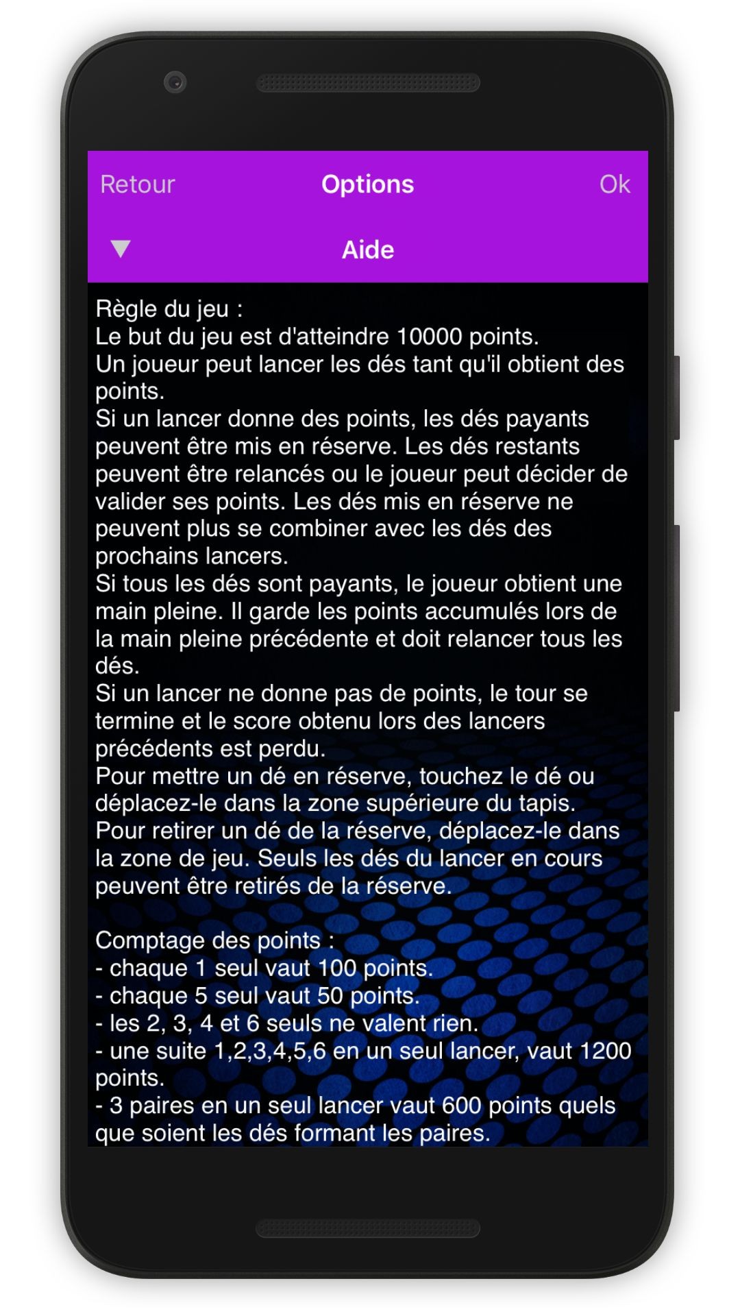 If a throw gives points, the paying dice can be banked. The remaining dice can be relaunched or the player can decide to validate his points. Dice put in reserve can not be combined with the next dice throws.