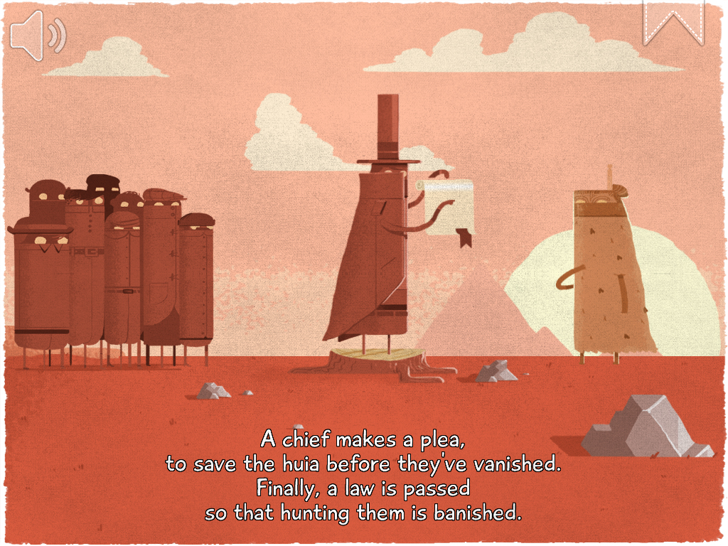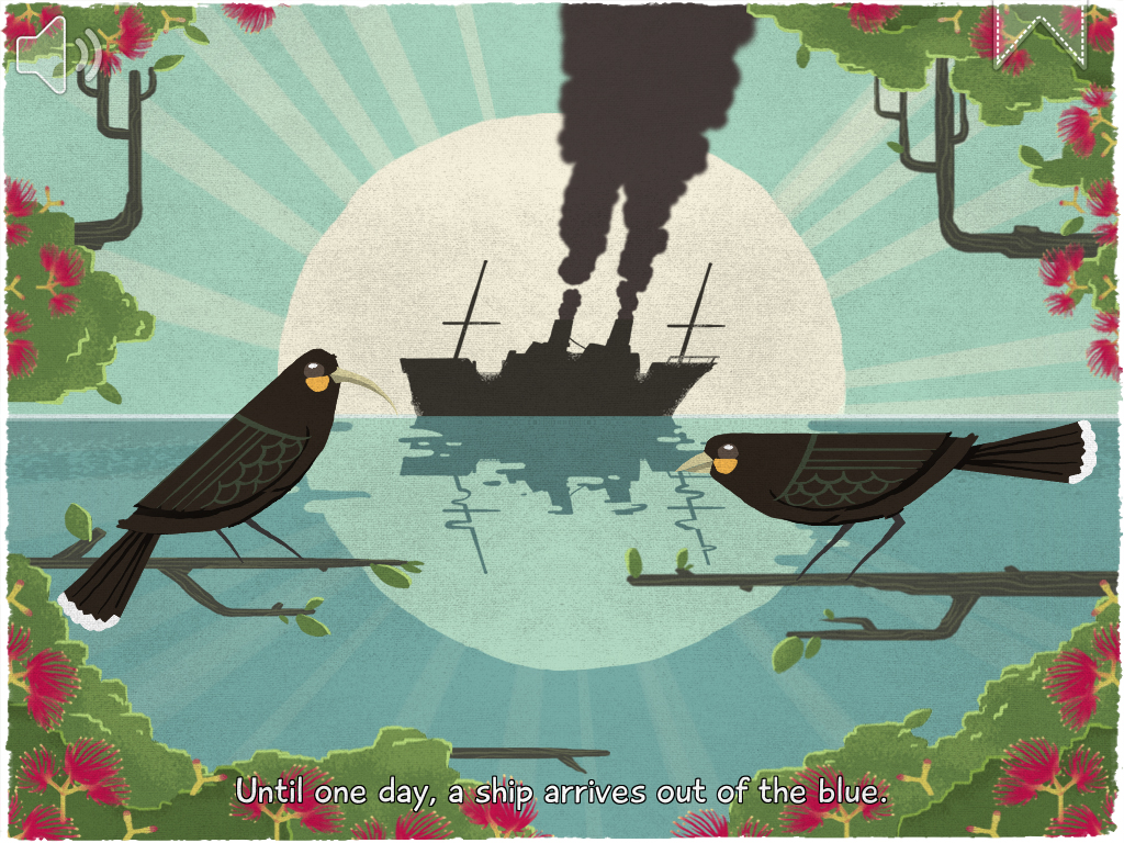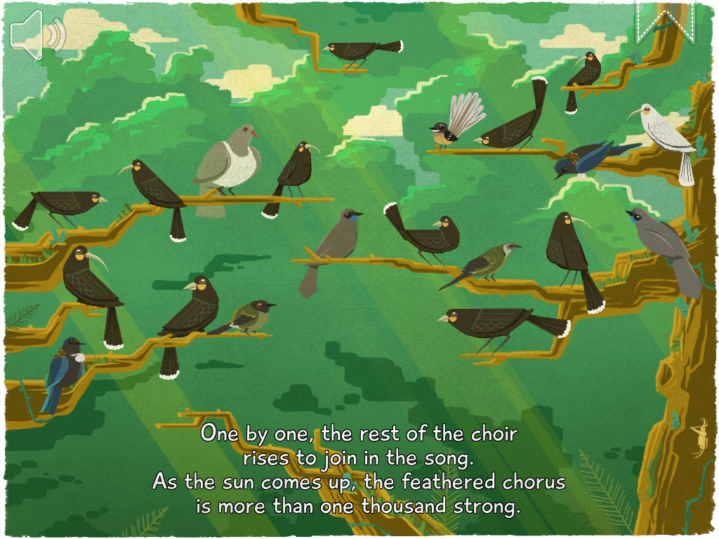 12 Huia Birds is a non-fiction book with a fable-esque treatment that seems almost like a fantasy. The story is filled with modern and graphically designed illustrations and features a storytelling process that requires the reader to advance the action themselves. The huia's beautiful call was never recorded so has been recreated especially for the app. Also included is a 360 degree video of a pair of real huia birds that you can rotate around.