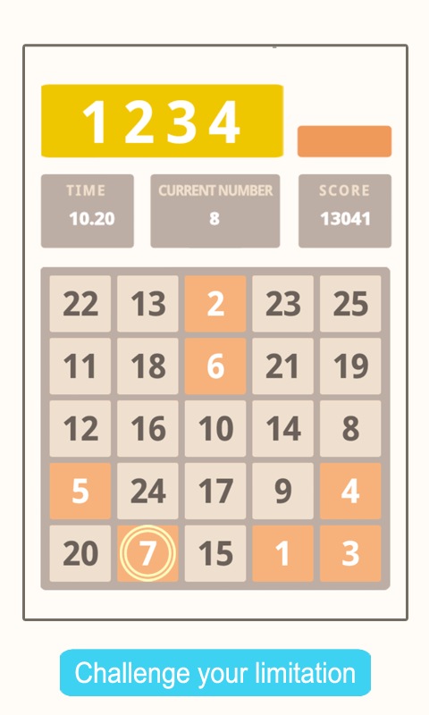 1234 is a fun but simple number game. Find out numbers from 1 sequentially, and higher score will get with more accurate and faster clicks. 1234 is designed with 3 levels, waiting for different challenges. Hope you can enjoy the game and exercise your vision, attention and reaction at the same time. Let’s dance our fingers upon numbers!