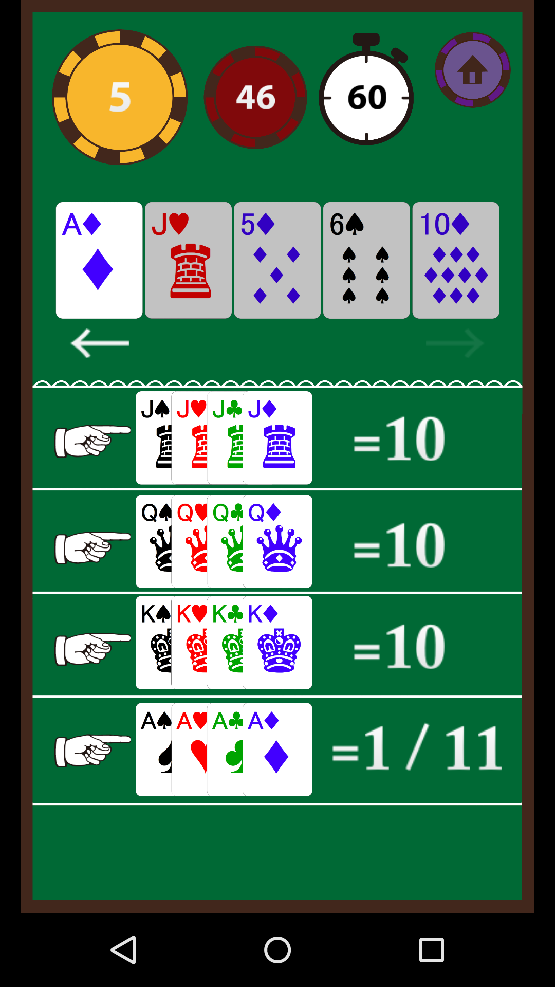 Kings, Queens, and Jacks are counted as 10; Aces as 1 or 11.