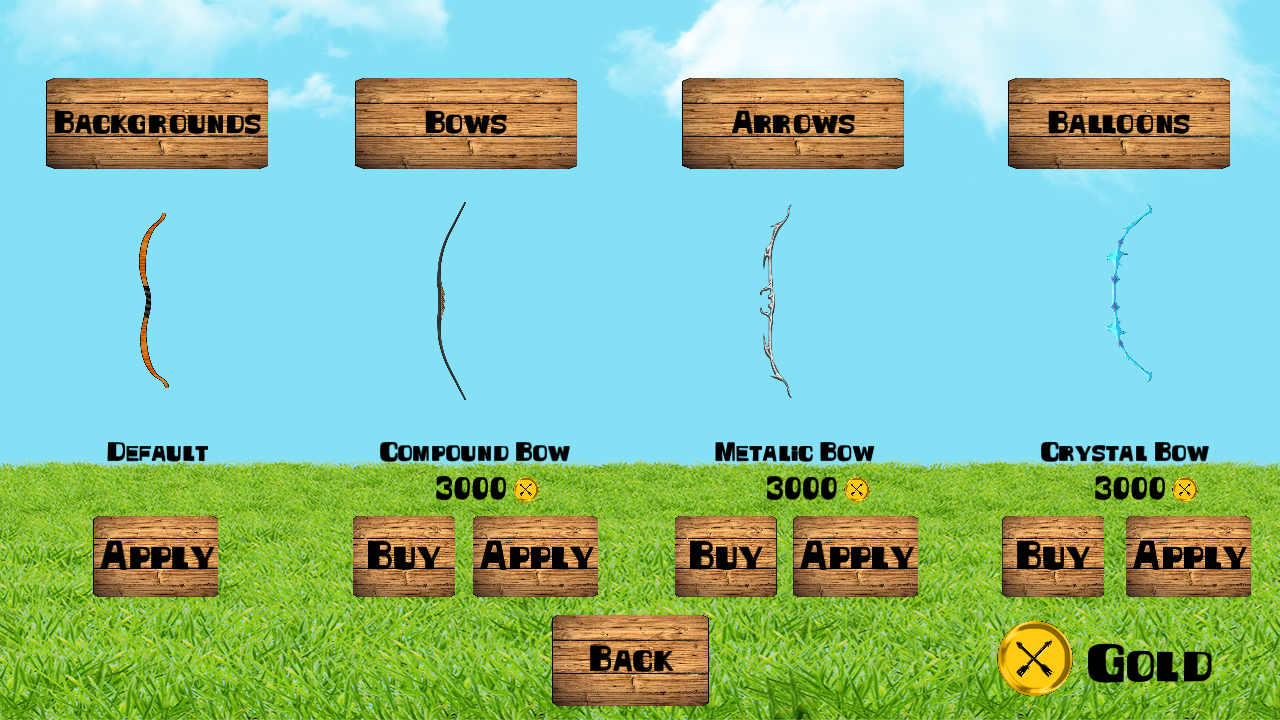 - Skin shop where you can buy skins for bows,arrows,backgrounds and even targets with in game currency;