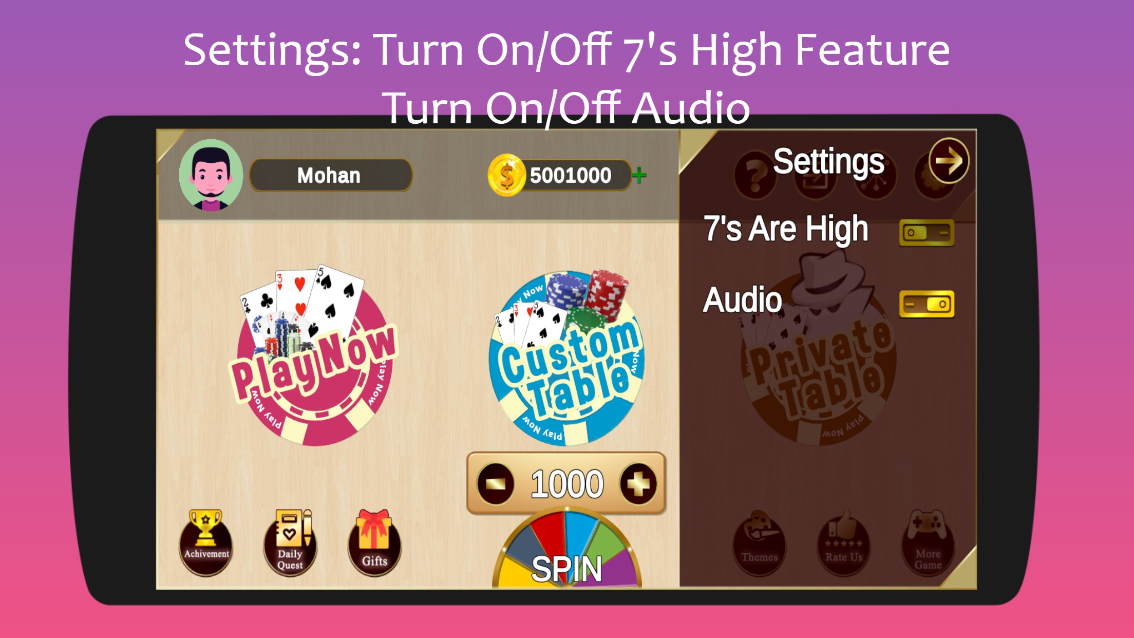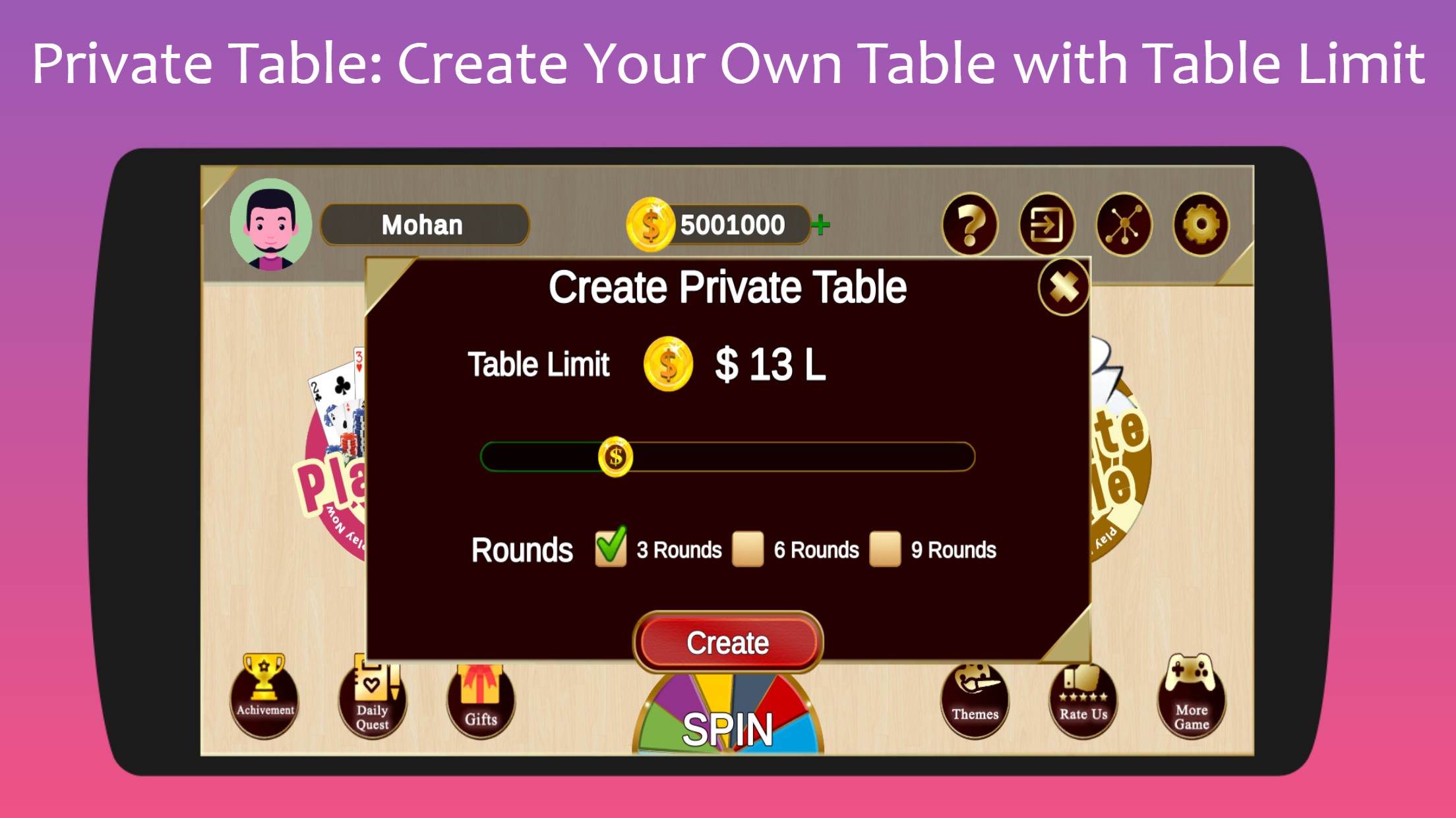 - Private Table: Enables users to select a number of rounds to play, along with the limit of table/coins.