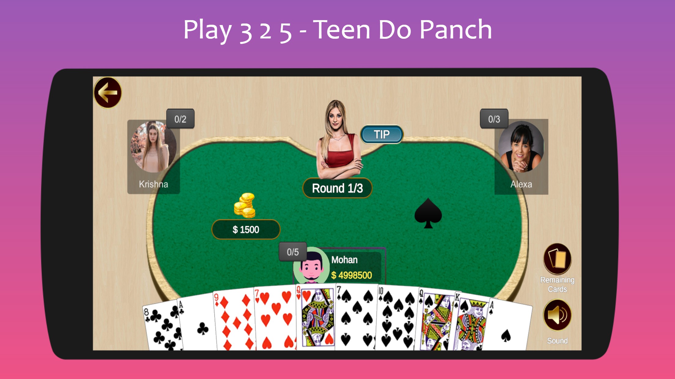 Teen do panch card game is a strategic trick-based card games popular played by three players with a deck of 30 playing cards. 3-2-5 card game is widely popular in India, Nepal and in Bangladesh. It is 2 player card game or three player card game.