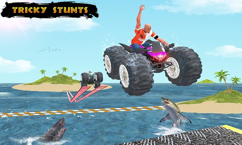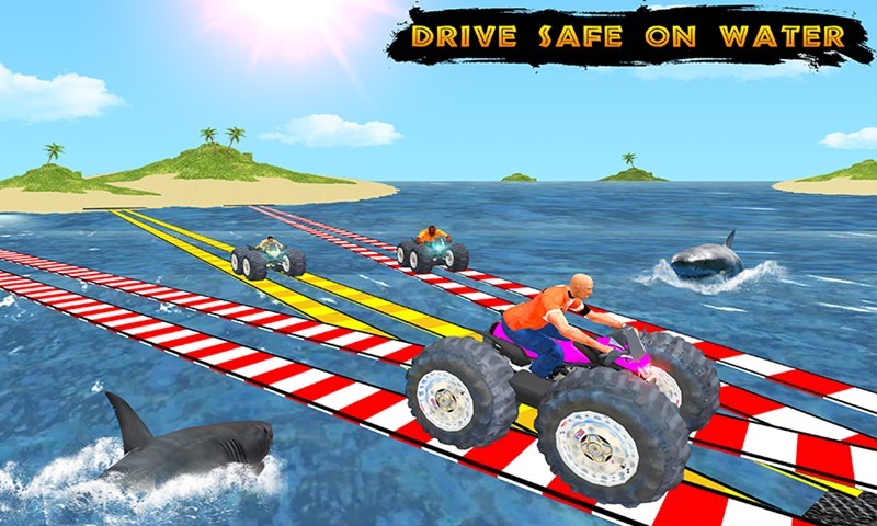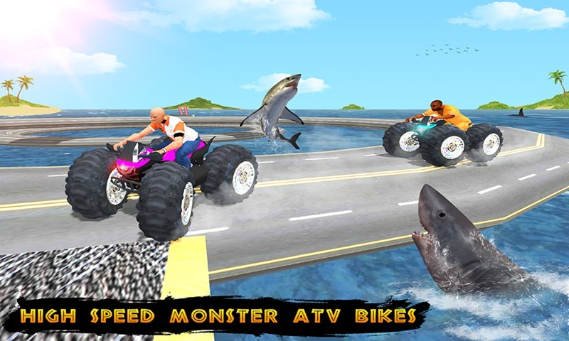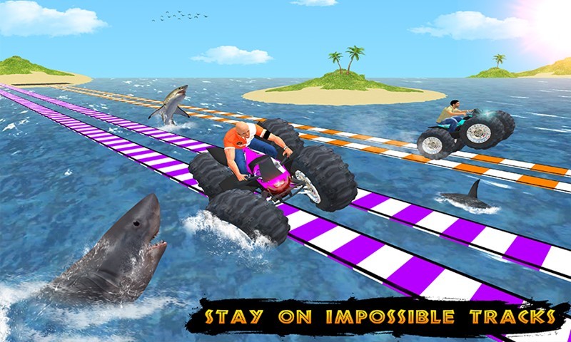 You think you are an excellent driver lets test your abilities in 99% impossible Monster ATV Bikes Tracks with the most dangerous breath taking tracks to drive on. The most Dearing tracks and amazing stunts to feel your heart in your mouth. Feel the fear of death by falling off the tracks and straight in to the sea full of hungry sharks. Improve your ATV bikes skills by playing this thrilling simulator and beware from man eater fishes.