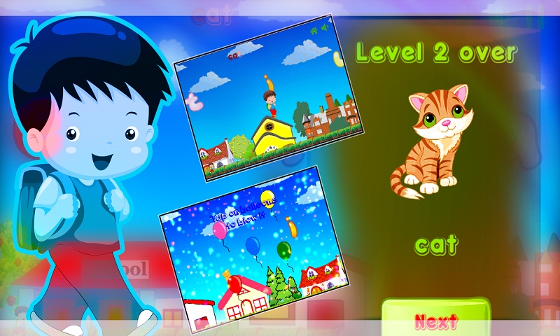When the level completes, there will be colorful balloons on the screen, by touching the balloons kids can see exhilarating balloon popping effects. So kids will have a fun combo of alphabets spelling learning and balloon poping games together.
