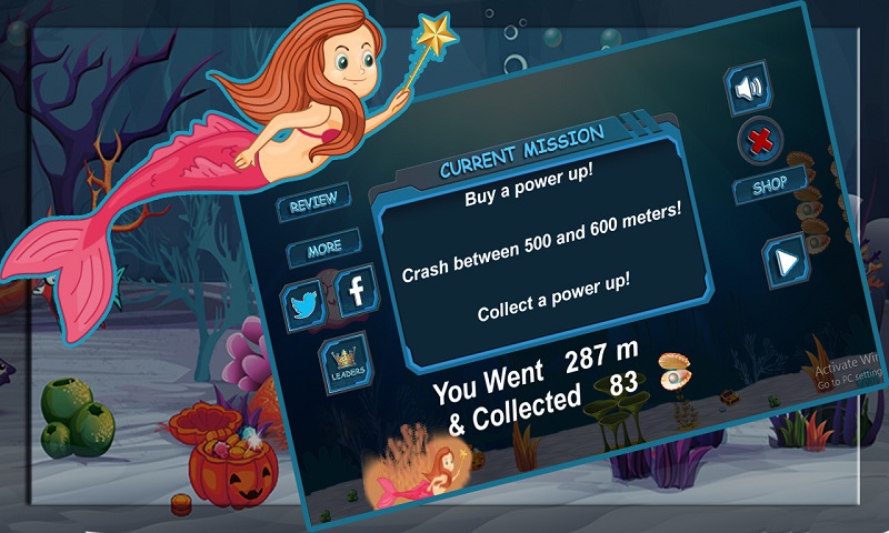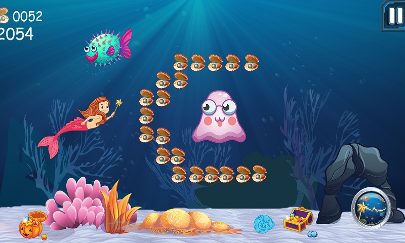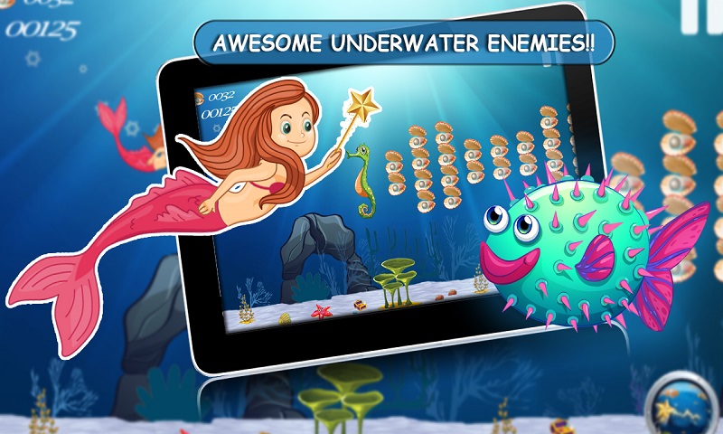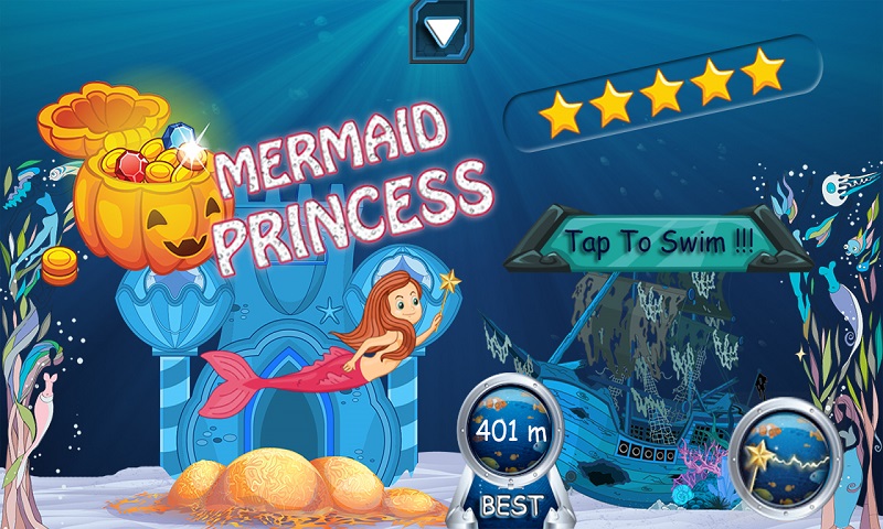 Princess swim in the sea with her magic power stick, during her journey she will collect lots of treasure and powers, with her power she can disappear giant sea creatures like long tail and clown fish.