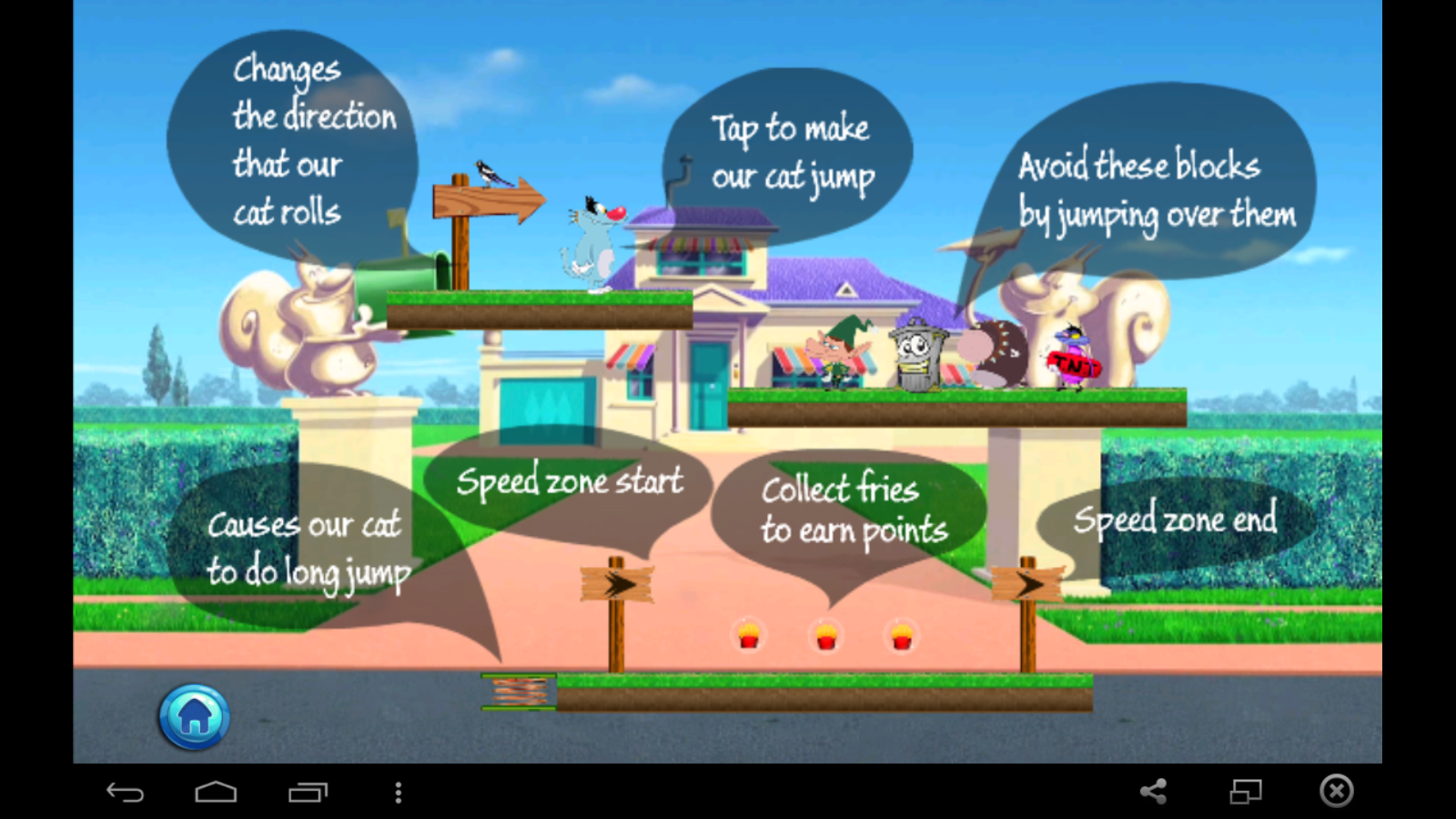Mais il y a nombreux obstacles sur son chemin; Les cafards avec des explosifs,Une poubelle, etc. S'il vous plaît aider OGGY par courir et sauter et Vivez l'aventure d'OGGY en parcourant différents niveaux avec différentes difficultés.