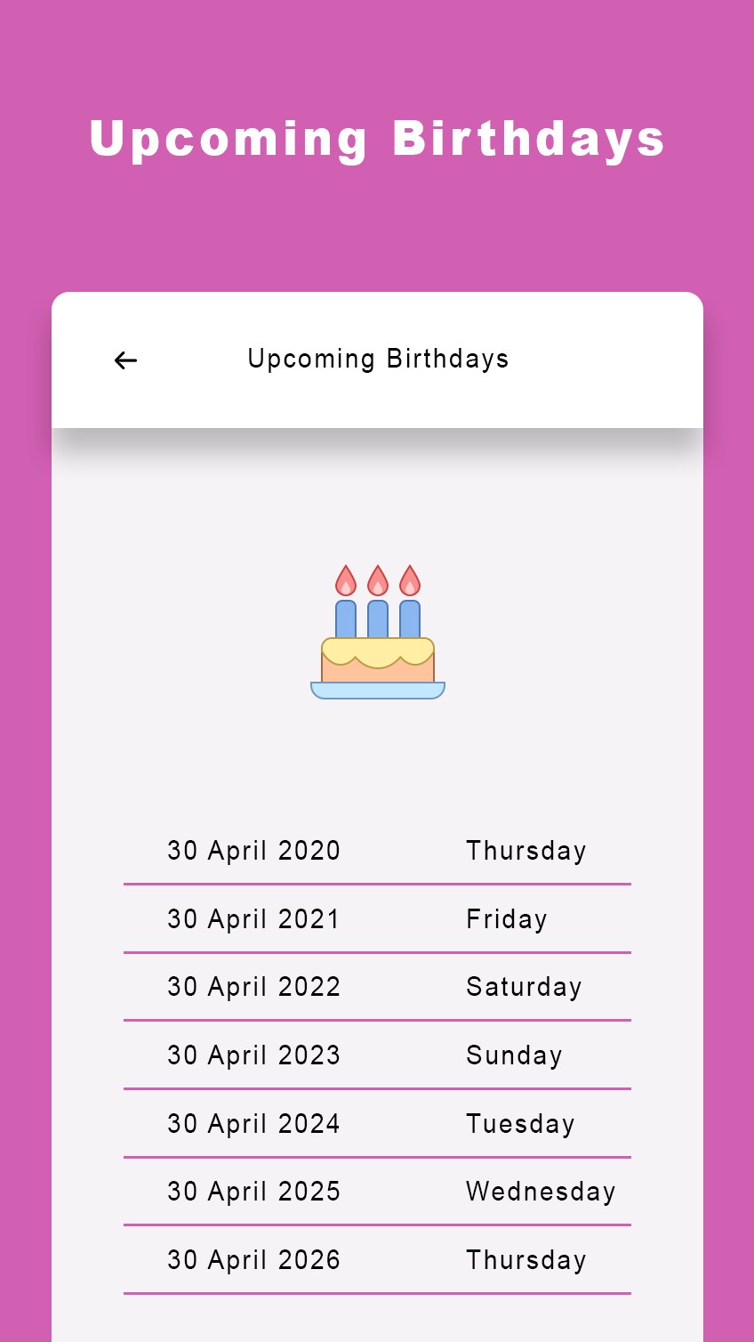 Online Age Calculator Birthday Reminder shows you when your next birthday. Age calculator Also save Date of birth of your love ones and gives you Reminder to celebrate your love ones birthday and give them surprise. Age calculator and Birthday Reminder also used in Admission Procedure to know the exact age.