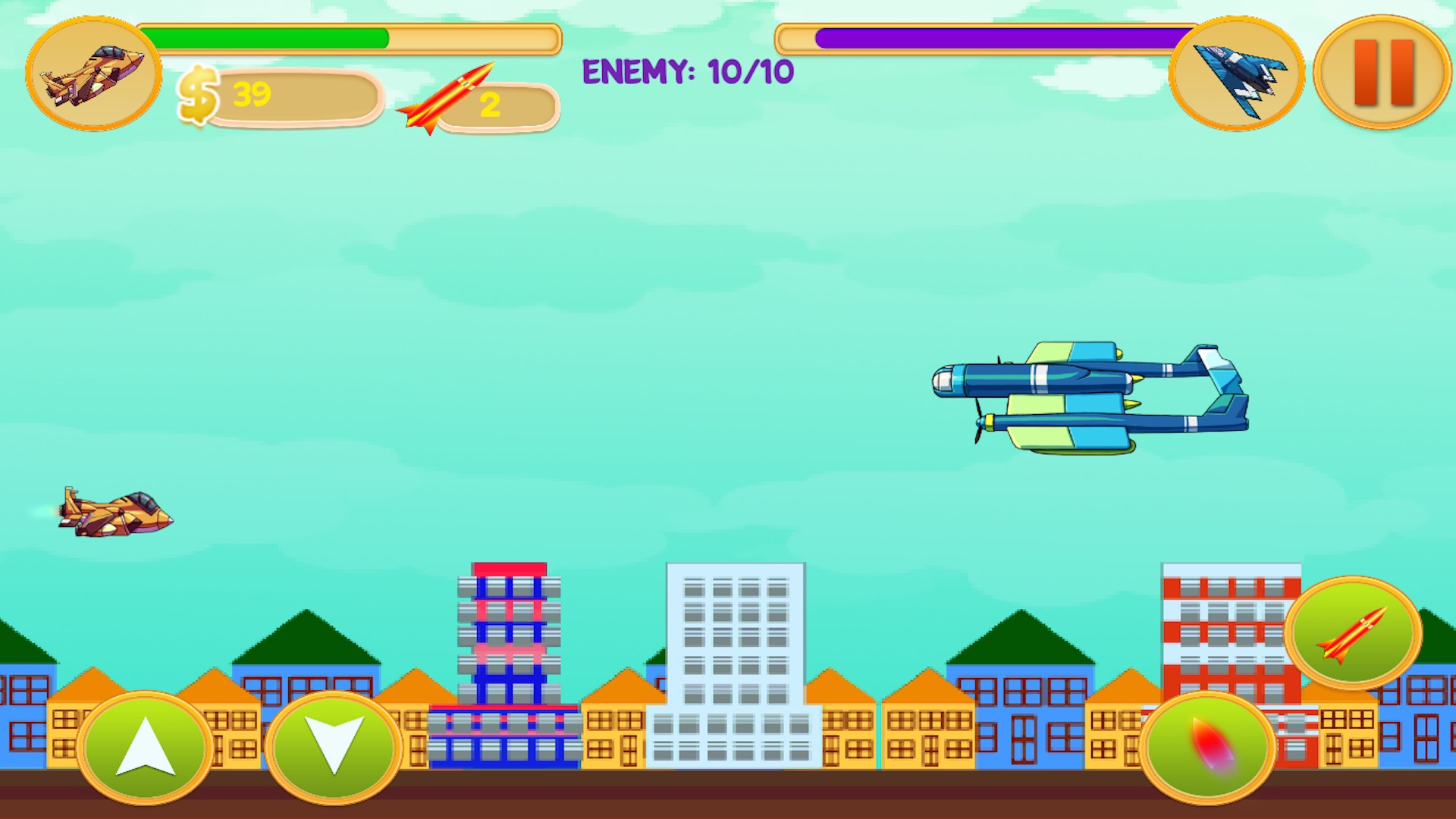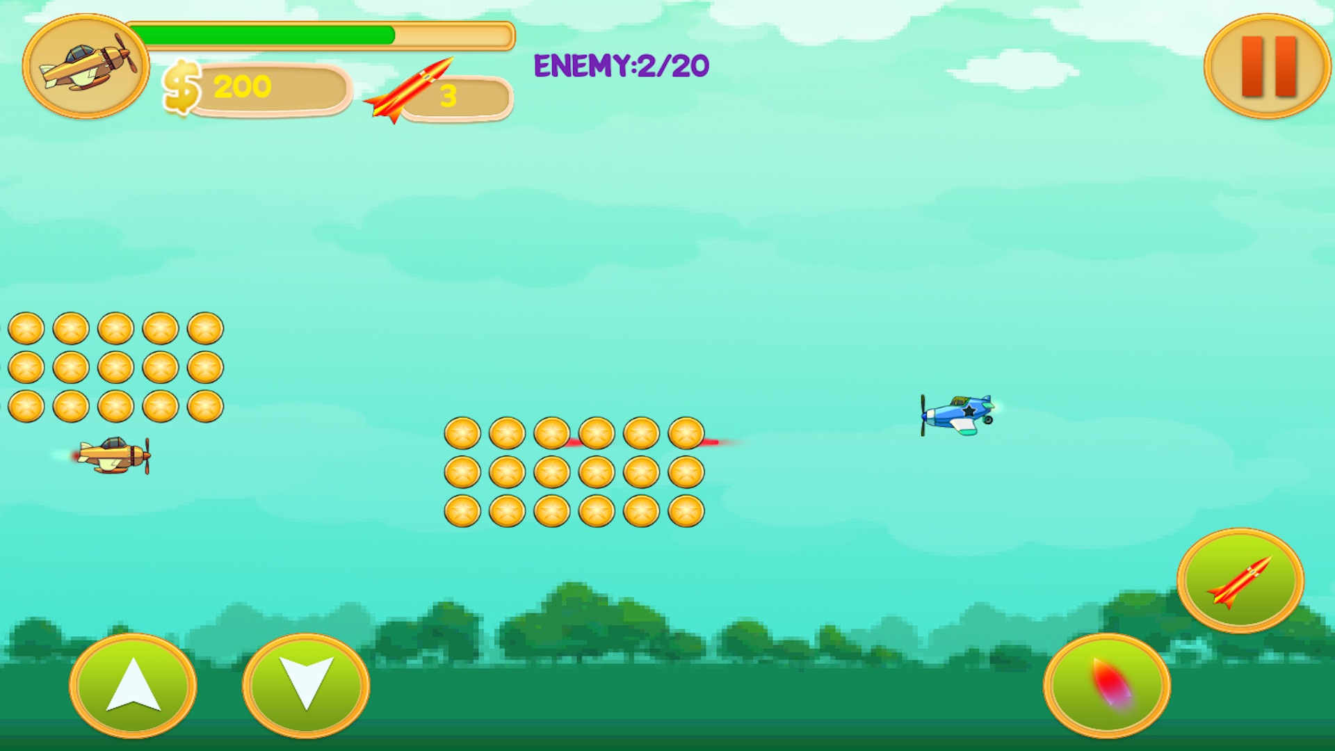 Play and enjoy Alien Spaceship War with enjoyable game effects! Take on the alien combat strike and enter the war for the glory of your country. Destroy enemy’s aircraft from the sky. Be watchful for the obstacles and deadly planes that will take you out. Collect coins to increase the points and unlock more powerful fighter jets in more challenging levels. Collect bonus missiles, which are more deadly for enemy’s jets, by completing each wave. Unlock all the missions by winning all waves and make highest scores among your friends.