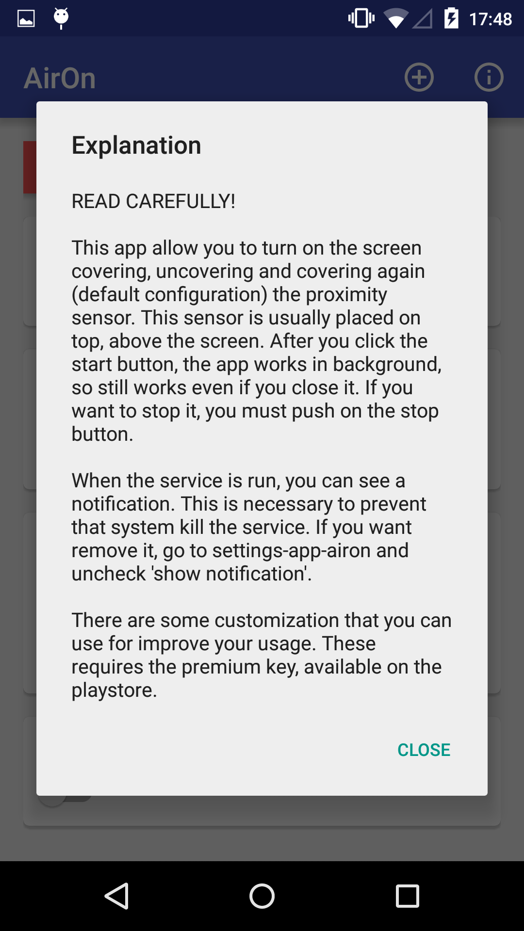 Please, note that when the service is running, a notification will be displayed, in order to ensure that the process is not killed by the system. If you don't like the notification, disable it in settings-app-airon, then unchecked "show notification".