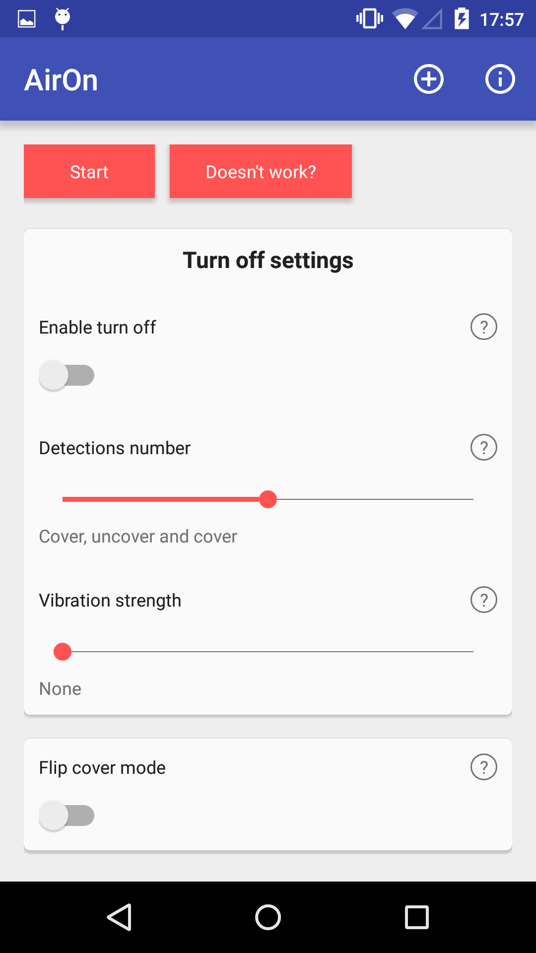 Designed in material design, AirOn allow you to turn on/off the screen covering the proximity sensor, then uncovering and covering it again (default config).