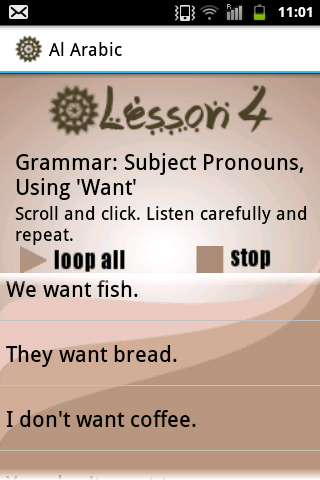 Al Arabic Listening and Speaking Series is grammar-based program to learn Arabic. Learn Arabic through grammar rules and structures. We just don't give you a list of vocabulary words to memorize. Instead the vocabulary words are centered around a grammatical lesson. By the end of each lesson, you should not only learn new Arabic words or phrases, but you should know how to actually use them in a grammatical context.