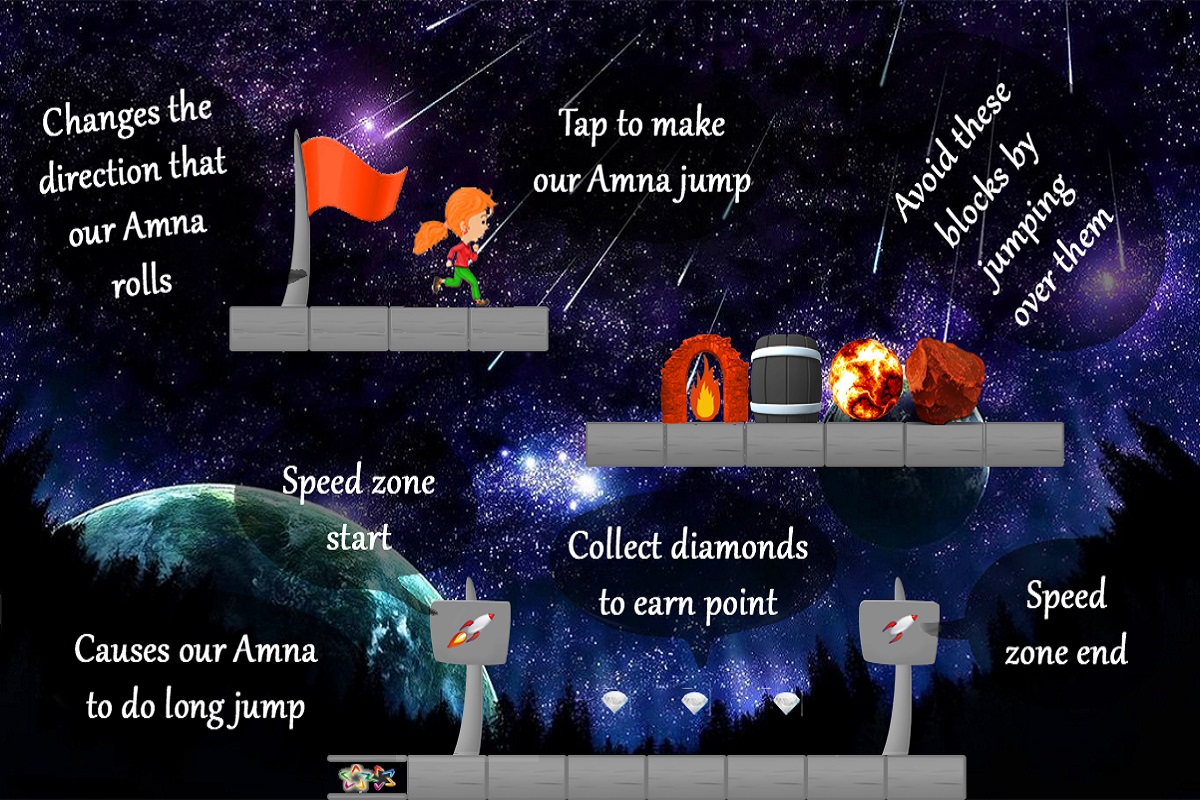 Would you like to explore galaxy with super cute character Amna? Be part of this amazing journey! DOWNLOAD this FREE GAME. Refresh your old school memories by playing this arcade running and adventure game like Super Mario. You can make Amna jump with a single tap of finger.