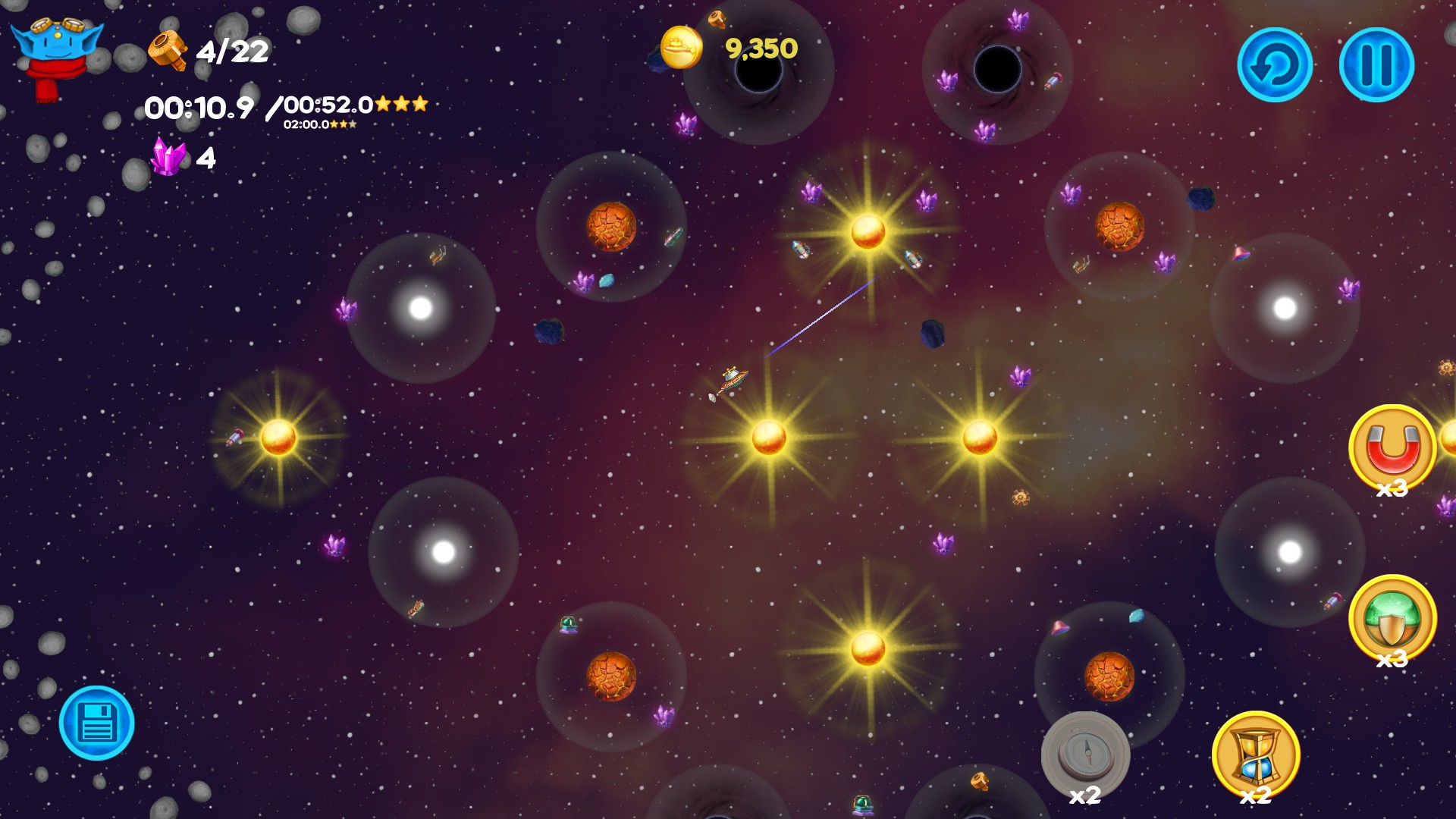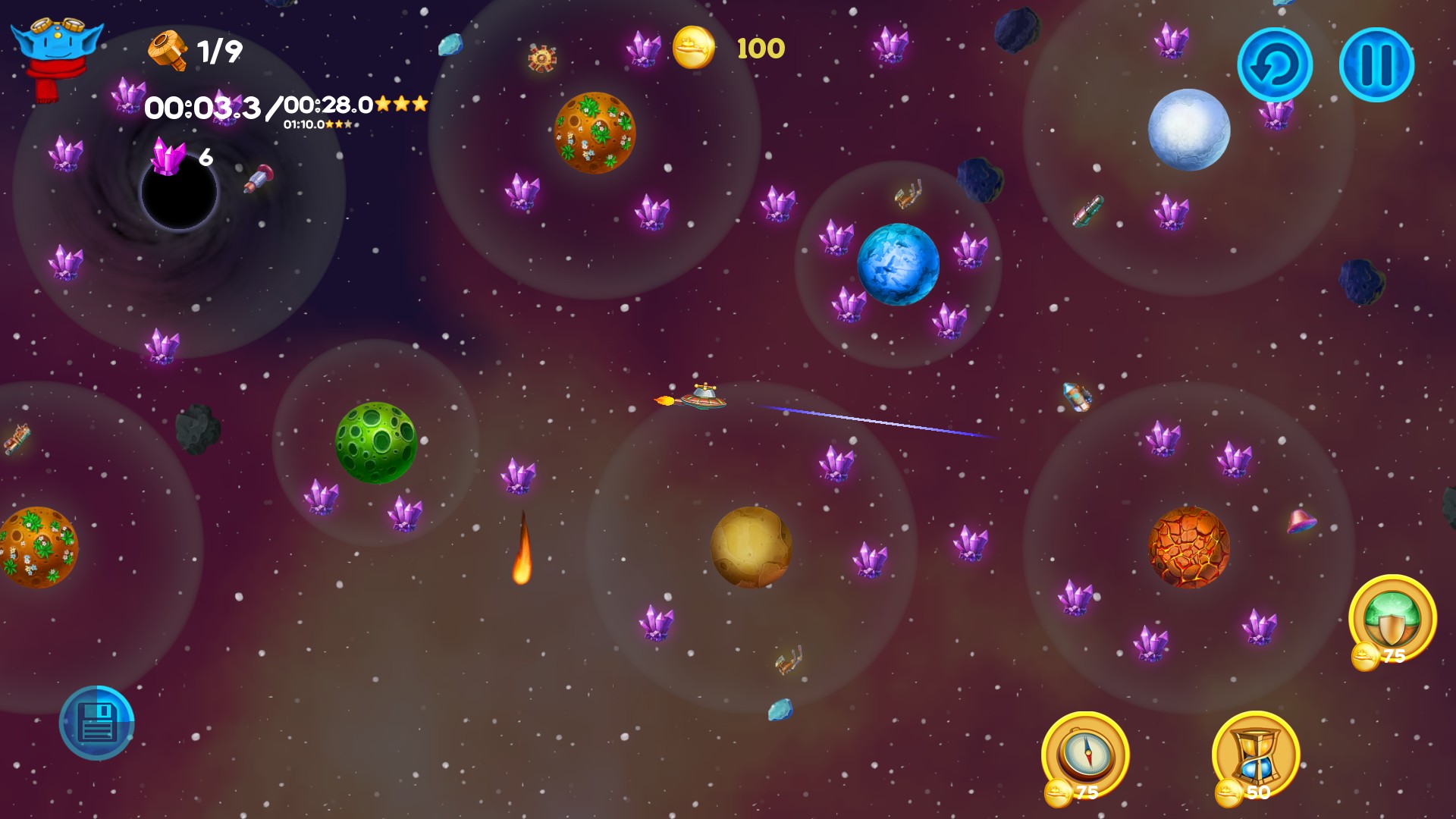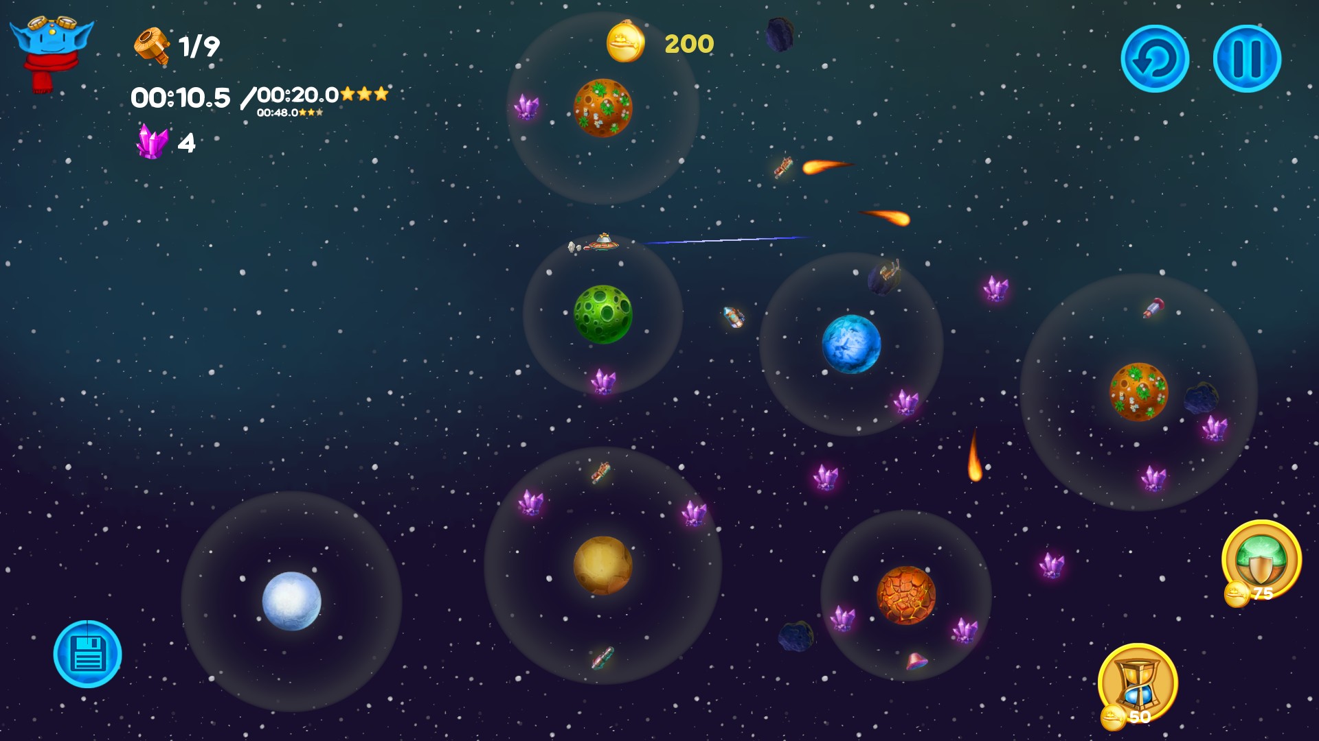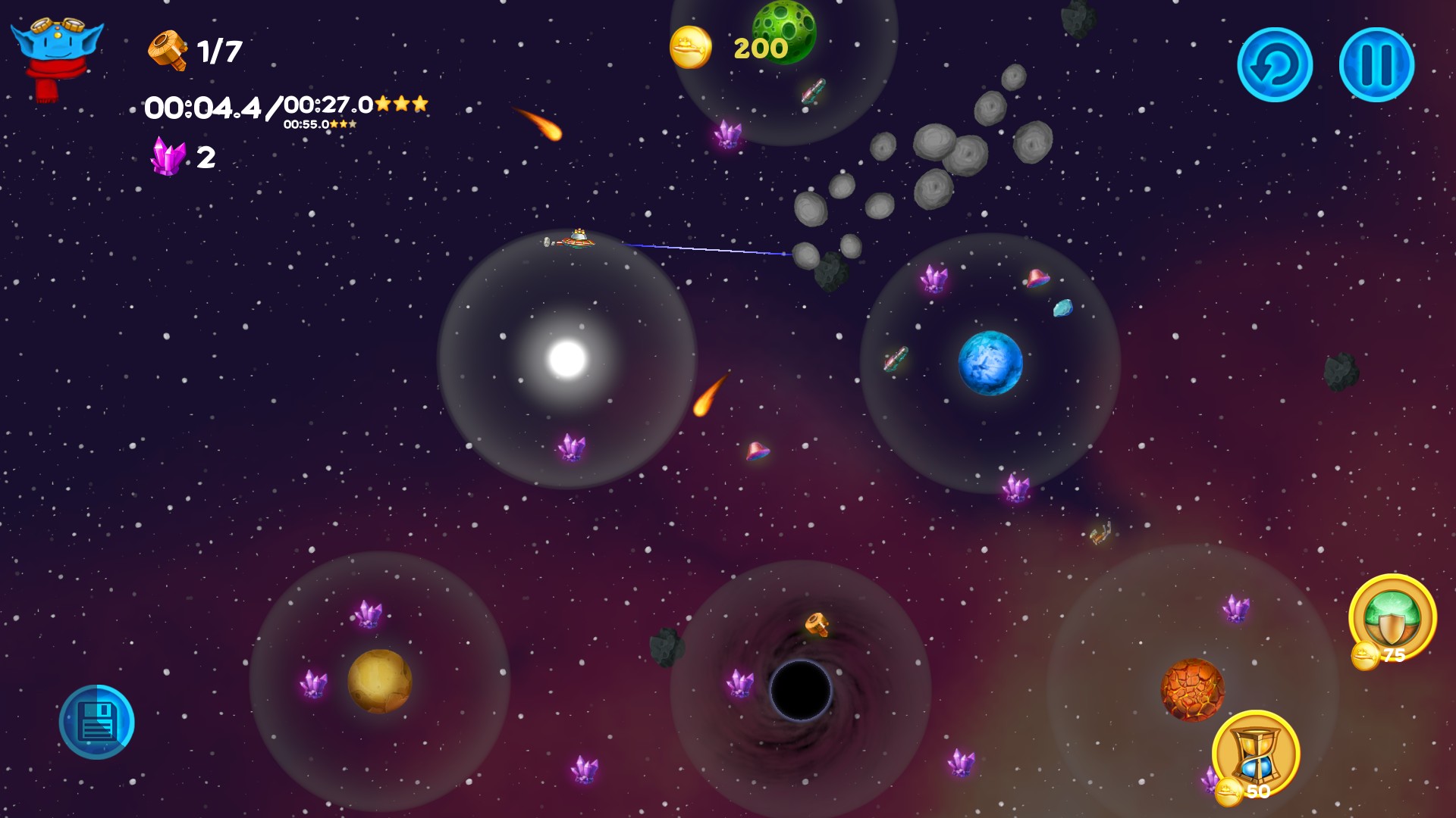 Among the Asteroids is an arcade with elements of puzzle for the whole family. You play as Lunny, cute alien pilot who travels through the space, collecting parts of the crashed ships to build large spaceship and to take his people to the new safe planet Placidus. Lunny mustn’t only avoid dangers lurking in space but also learn how to use them to complete his mission. He has to deal with asteroids, black holes, pulsars, exploding stars and even space magnetic tornado to make his people safe. While passing the scenario you will unlock two endless modes. Scoring and achievements systems will help you to show you are the best ;)