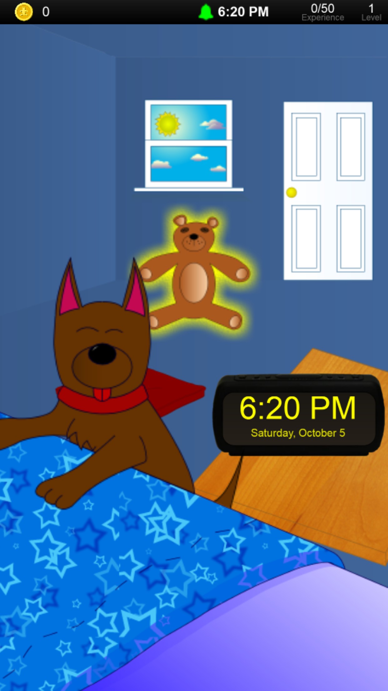 Wake up promptly after your first alarm goes off in order to rescue the teddy bear from your angry pet dog and earn extra coins and experience points...but snooze, and your angry pet dog will rip your cute teddy bear apart limb by limb progressively after each of your snooze alarms goes off - like hang-man games, except your teddy bear is losing limbs when you snooze instead of gaining them.