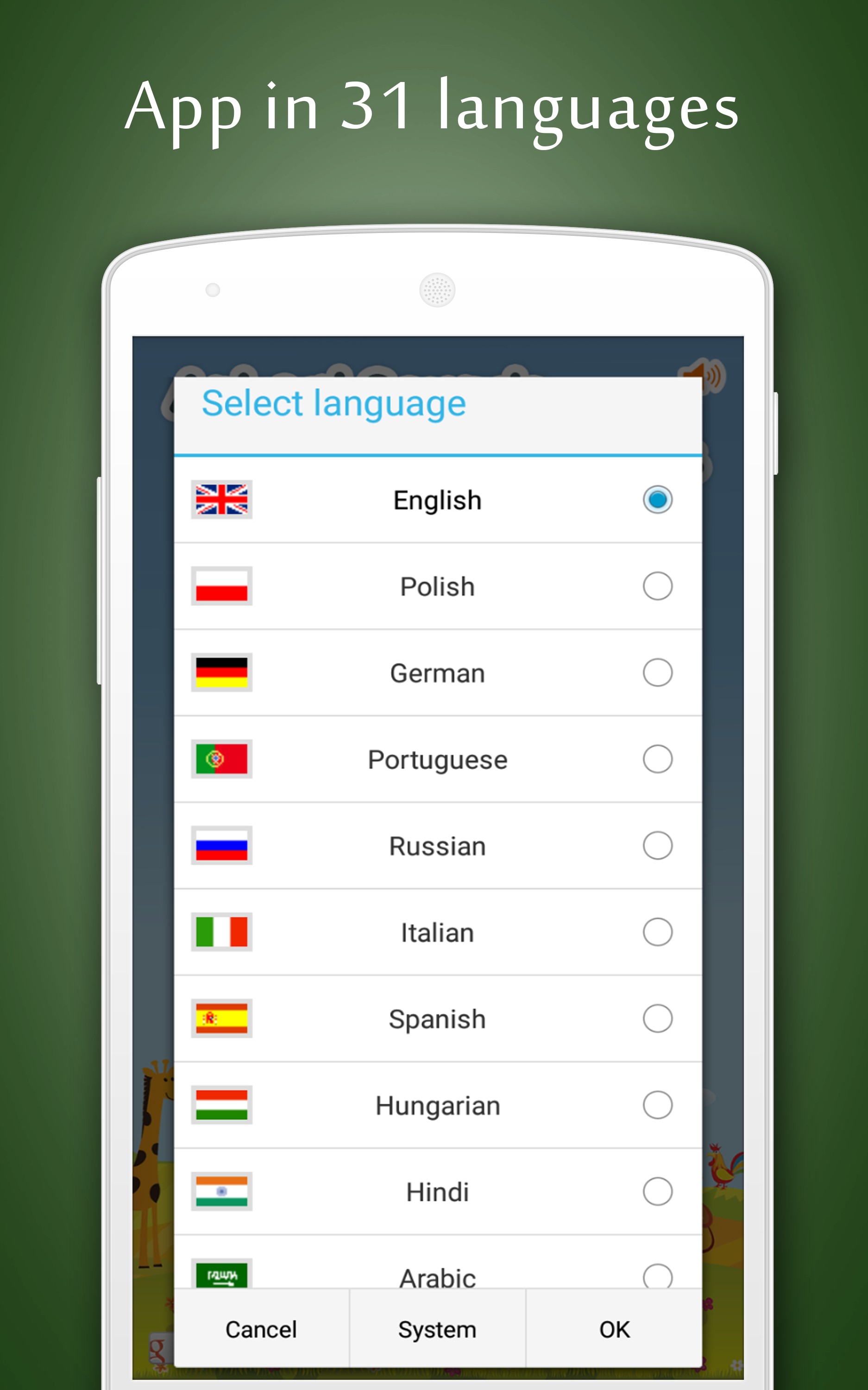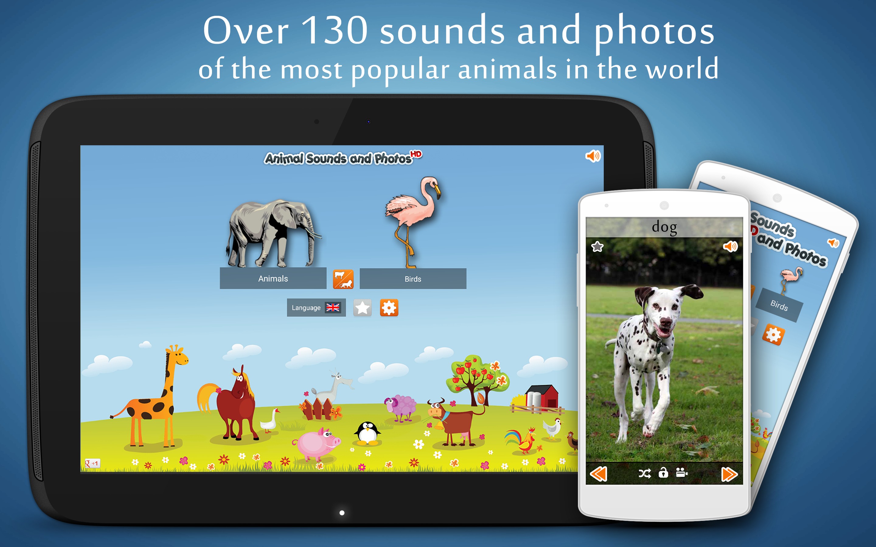 With the language change option the animal sounds application can also be used as a set of cards to learn the language (kids learn animals in 37 different languages).