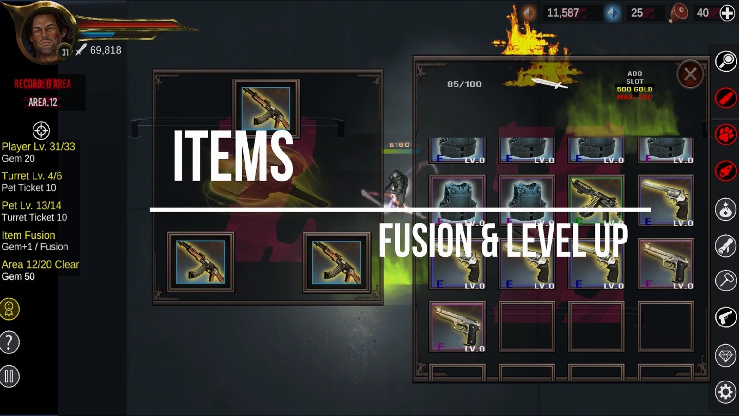 매우 높은 확률로 쏟아지는 아이템을 획득하세요. 당신은 그것들을 융합하고 강화하여 매우 빠르게 성장할 수 있습니다.