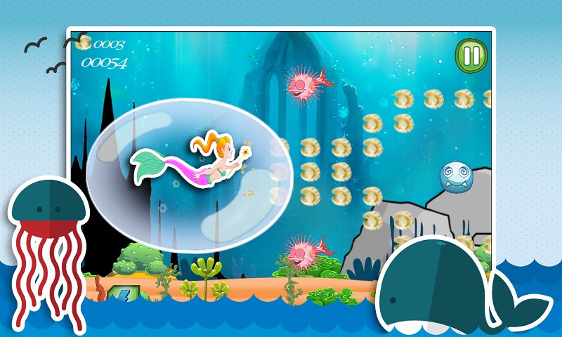 Mermaid princess swim through beautiful reef of the sea with her magic power stick, to collect lots of treasures and powers during her voyage. With her power she can wipe out giant sea creatures like sea horse and clown fish. Be watchful, avoid overcoming obstacles in mermaid princess way.