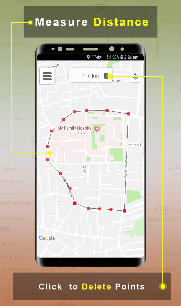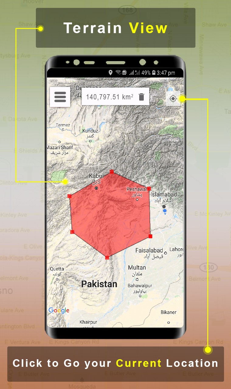 Distance and area measurement App has different types of view in built in form Satellite View, Terrine View, Hybrid view. Gps Field Area Measure is being used for multi purposes. Calculate the area for Dam and for Farm Fencing with Gps land Measurement. Players can also Track their Route distance.