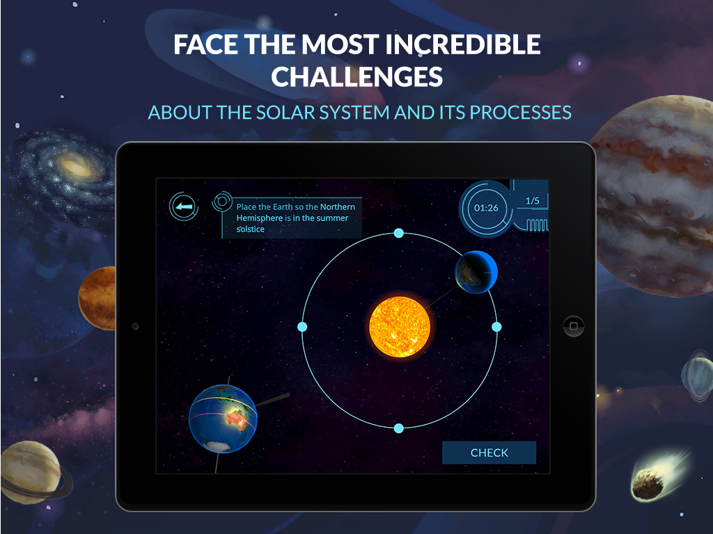 With this application, understanding concepts far removed from the student’s environment like eclipses, the Earth’s trajectory, rotations, orbits, etc. is simple and stimulating. It is designed to meet the goals and content of the primary education syllabus and includes a section with exercises for different levels that enable students to practice, check what they’ve learned, and work together in a way suited to individual needs.