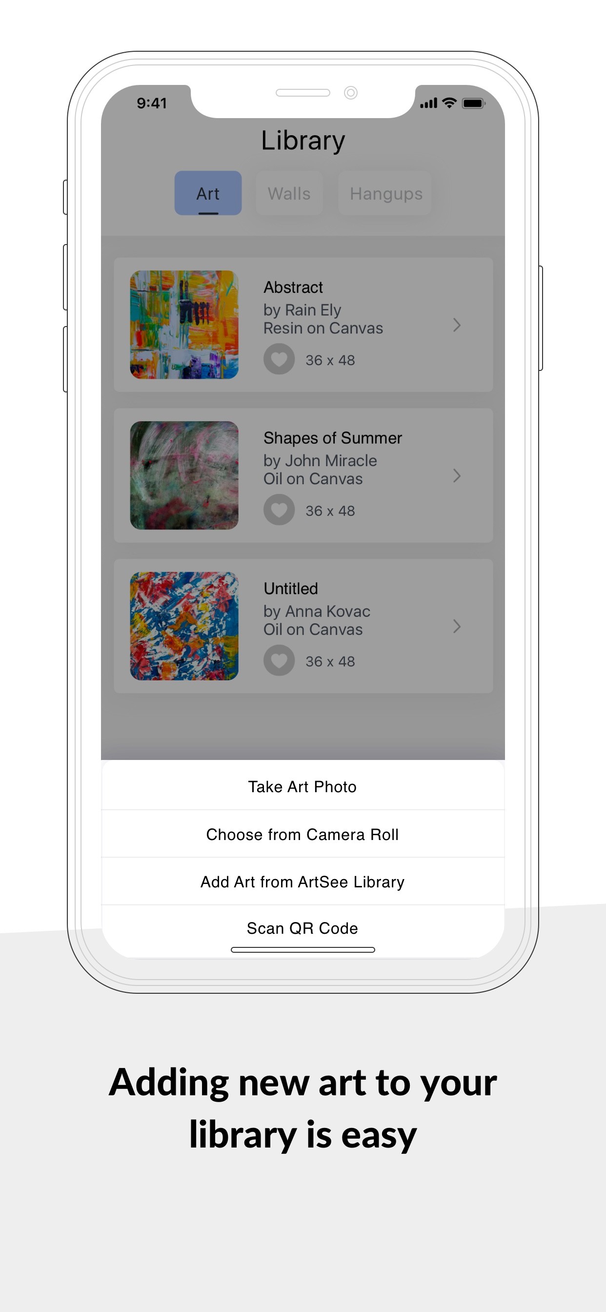 With ARTSEE, you can add your home walls to your personal library, take photos of art wherever you are and preview it on your walls at home! Determining how art would look at home has never been so easy.