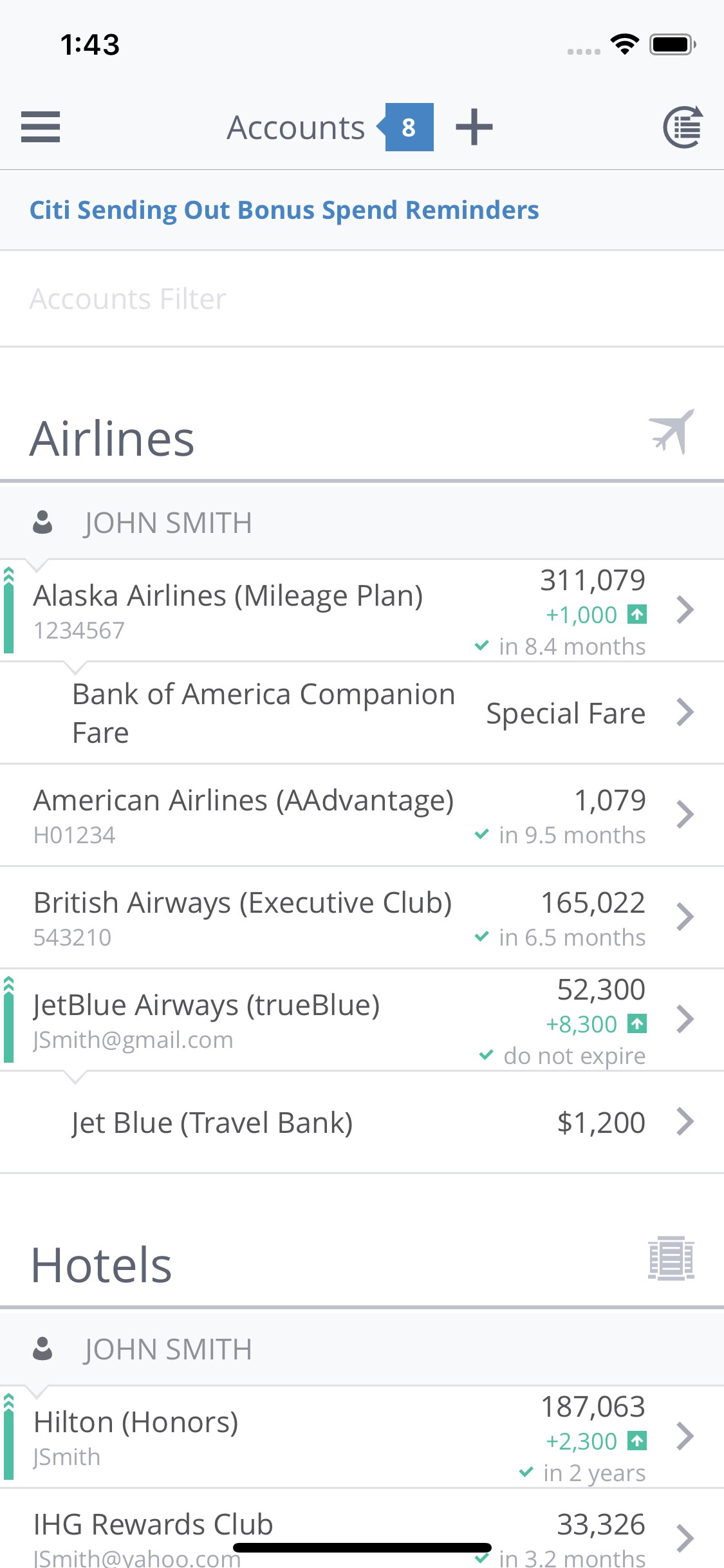 If there is a loyalty program that offers you incentive points, we will help you track your points. Best of all, we alert you when your balances change and before points expire.
