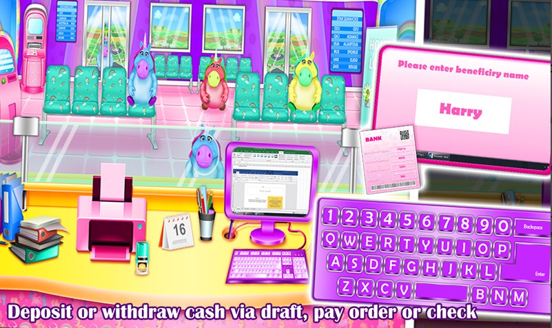 Serve & help the Unicorn clients in the bank with their requirements in a given time. Help them operating ATM, help them with their pay cheque, bank statements deposit and cash withdrawal with simple step by step procedure and make them happy clients. Learn to operate this simple bank as a cashier and bank manager today.