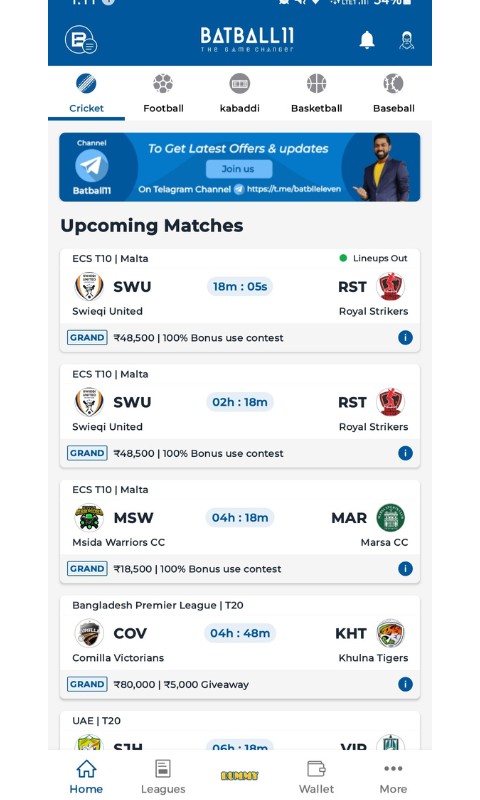 BatBall11 is an exciting fantasy sports platform where skill meets opportunity. A user-friendly interface offers a seamless experience for sports enthusiasts to create teams, join contests, and win real cash rewards. Whether you're a cricket lover or a fan of other sports, BatBall11 enhances the thrill by blending strategy and passion. Its daily contests and unique features make it a standout choice for those looking to test their knowledge and earn money while enjoying their favorite games. Play smart, play BatBall11, and get in the game like never before!