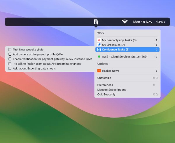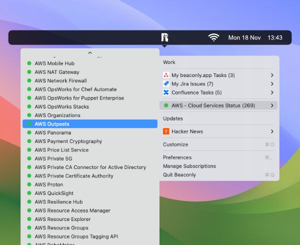 Beaconly turns your macOS menu bar into a powerful hub of productivity. Access your critical tools, services, and updates—all without interrupting your workflow. Track tasks from platforms like Jira, Asana, and Trello, Linear and others, monitor service statuses like AWS and Google Cloud, or check crypto prices—all at a glance.