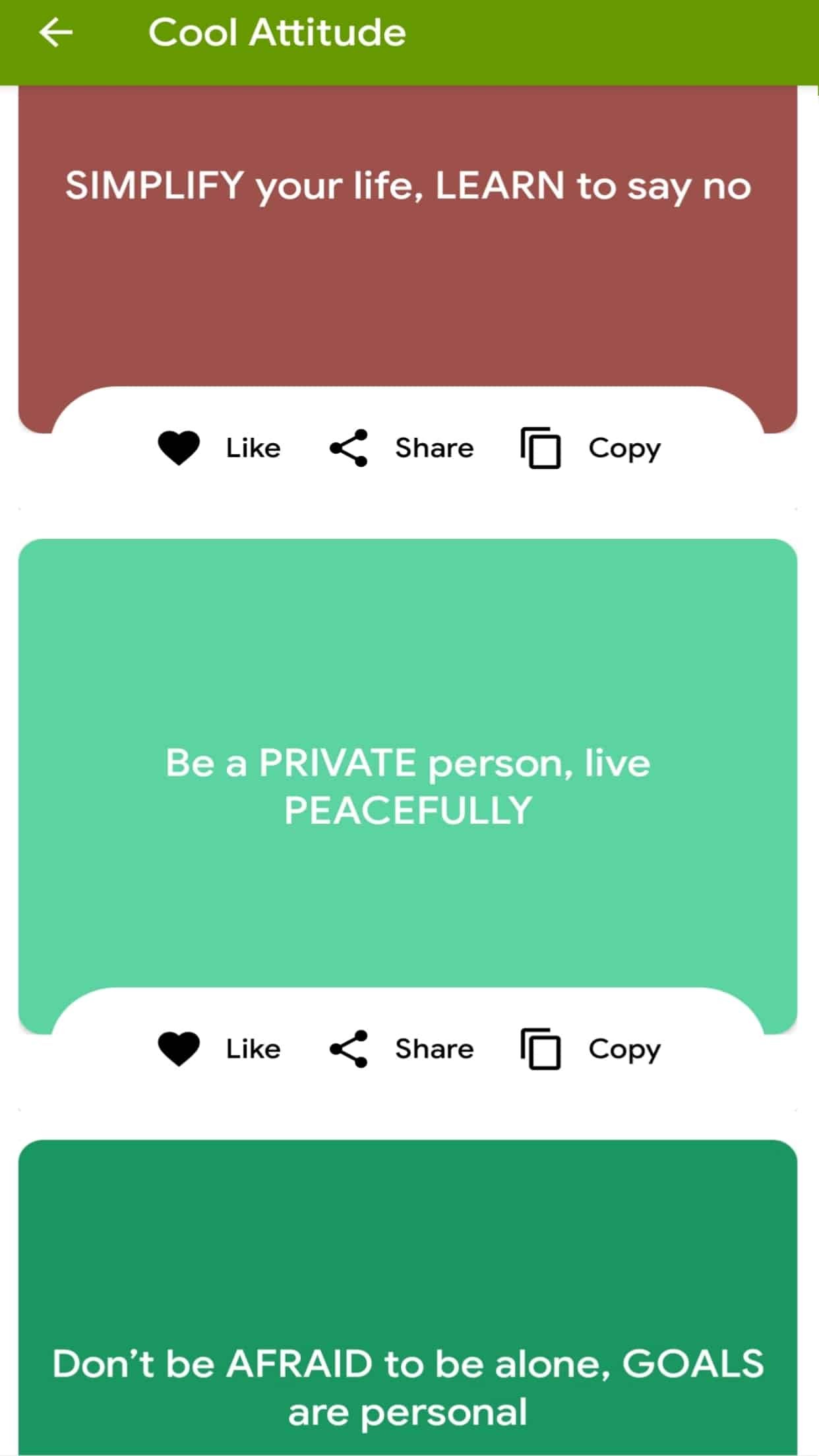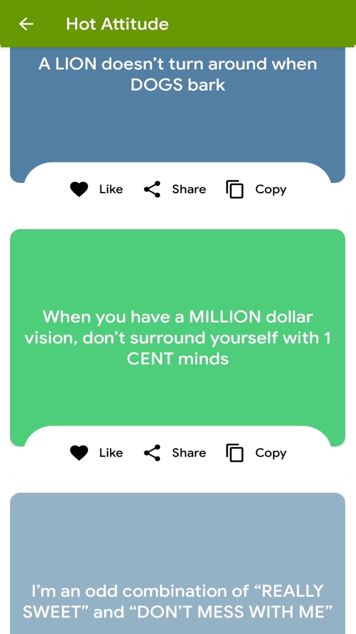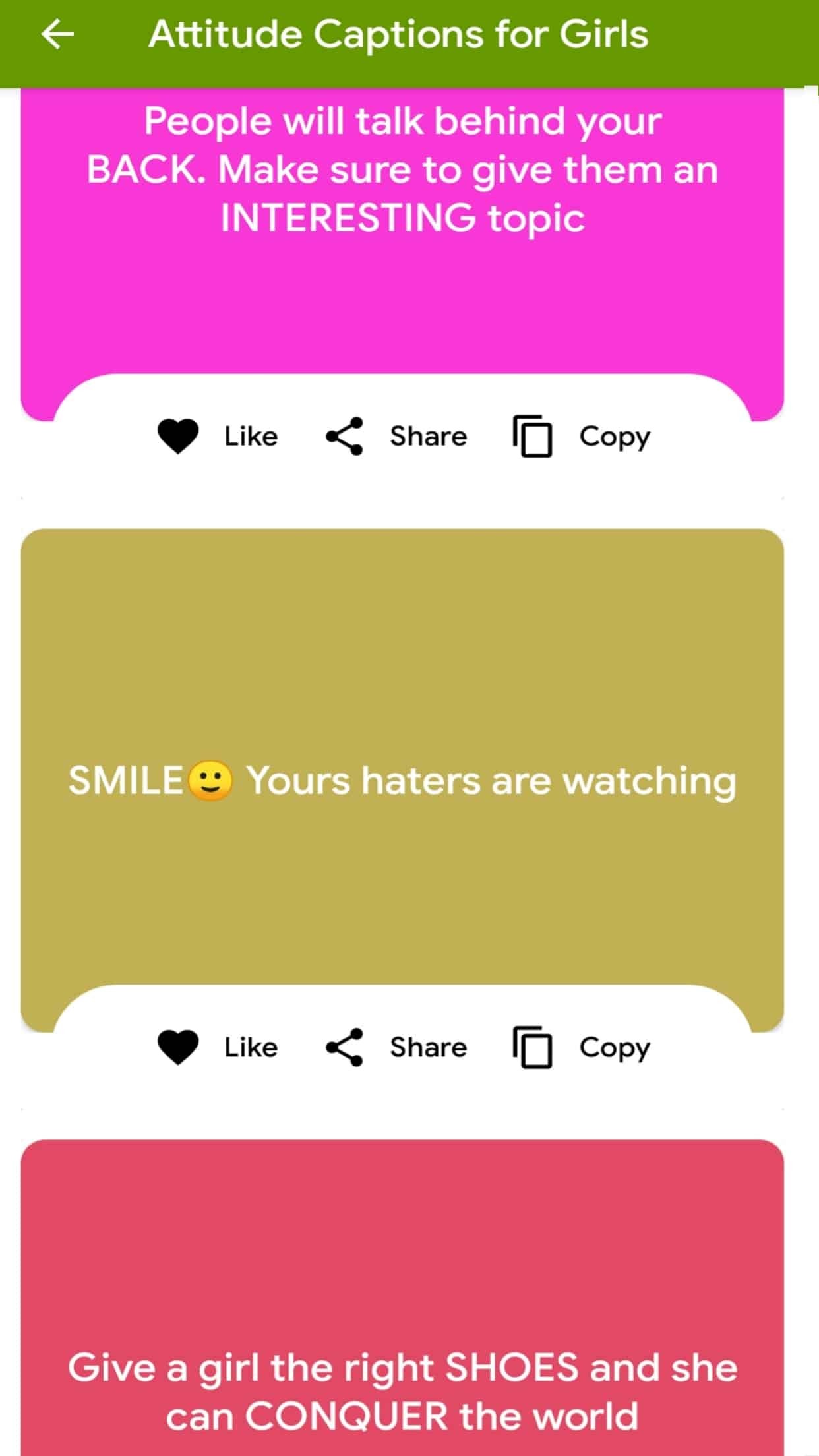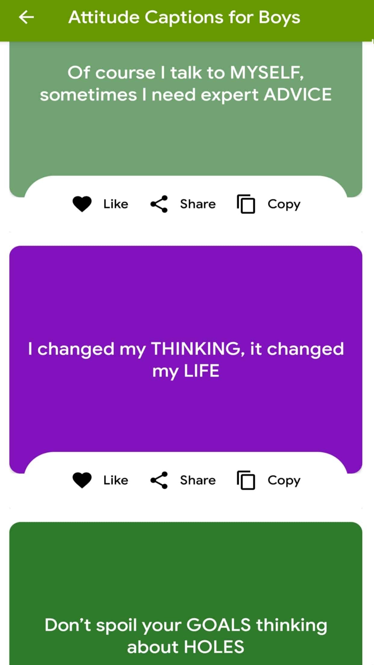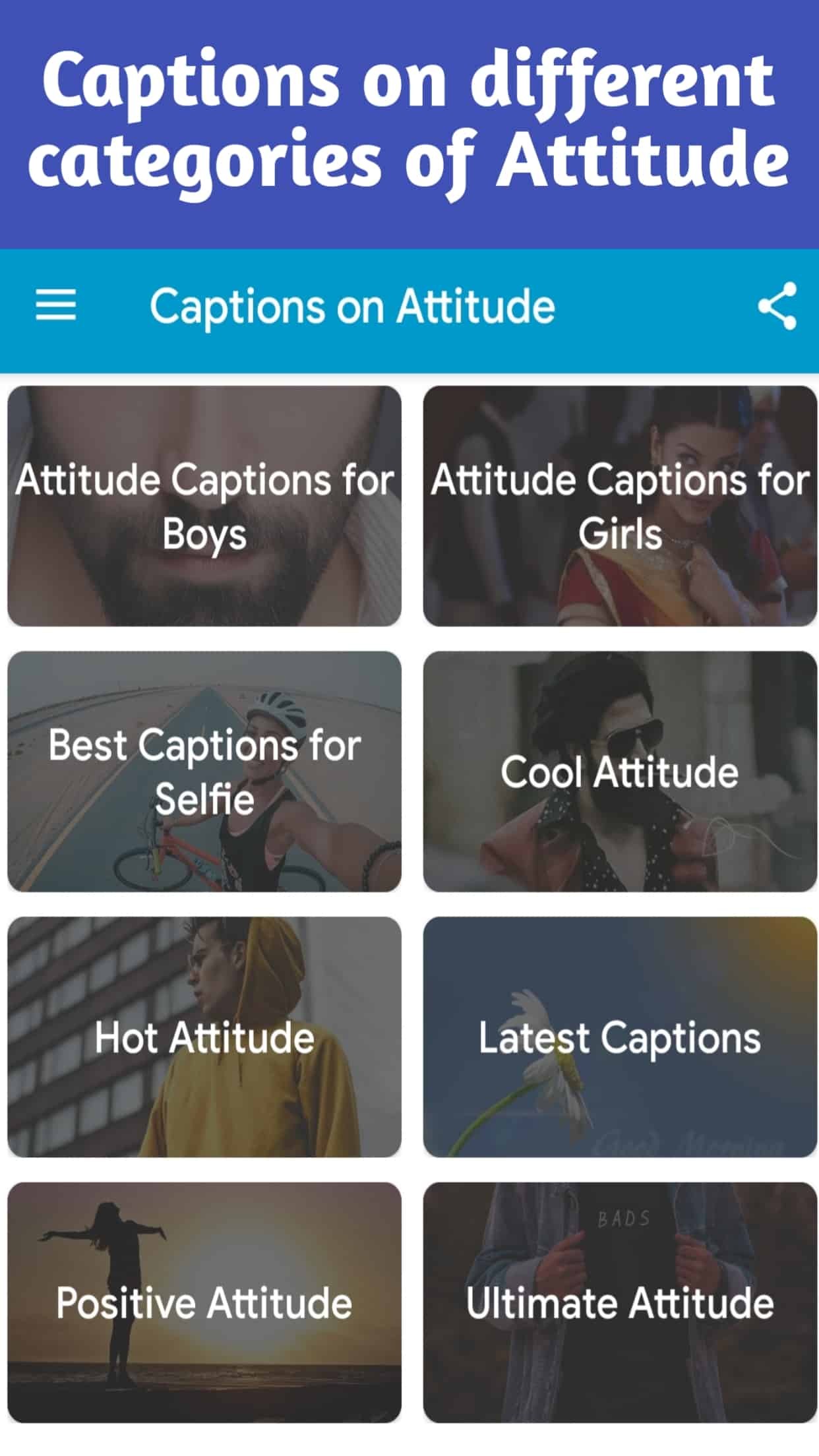 Our app on Captions on Attitude brings you the best attitude captions, status in English for Instagram, FB and Whatsapp. Express yourself with different kind of attitude captions like attitude for boys, attitude for girls, cool attitude, latest attitude status, selfie captions in 2020. The captions are very easy to copy and share. You can use this attitude captions on various social platform like Instagram, Facebook DP etc.