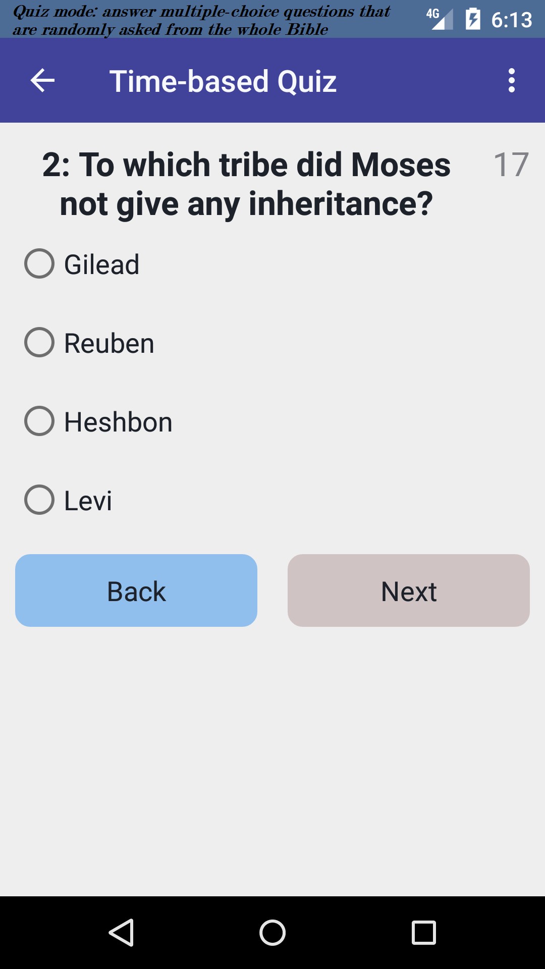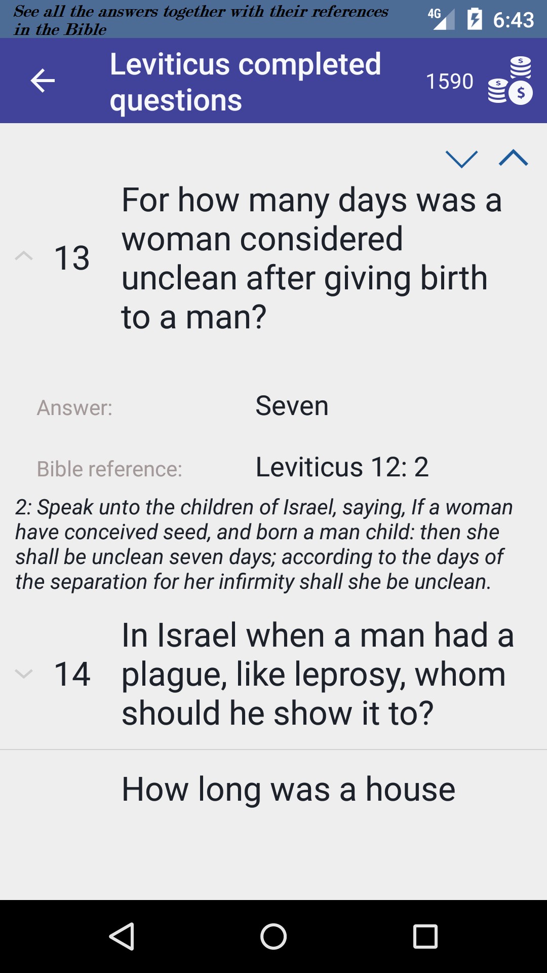 - Quiz mode: in 3 different quiz types answer multiple-choice questions randomly asked from the whole Bible. Contains over 400 questions.