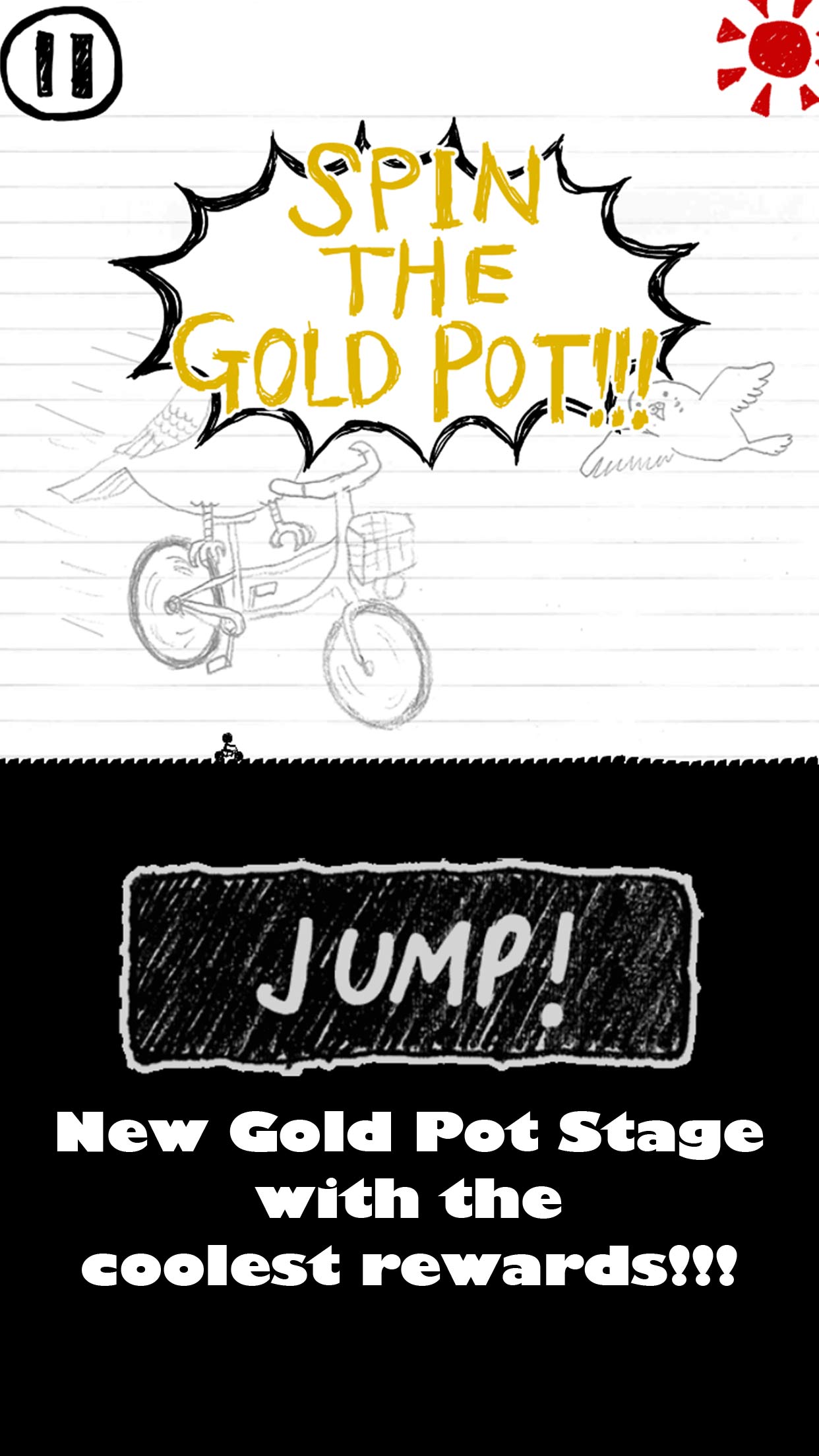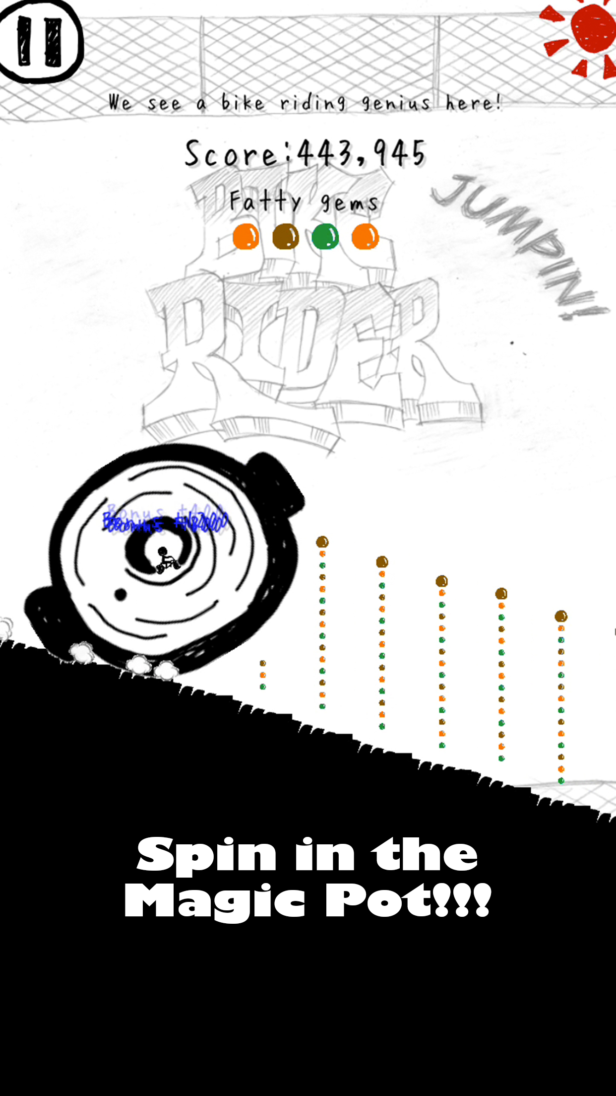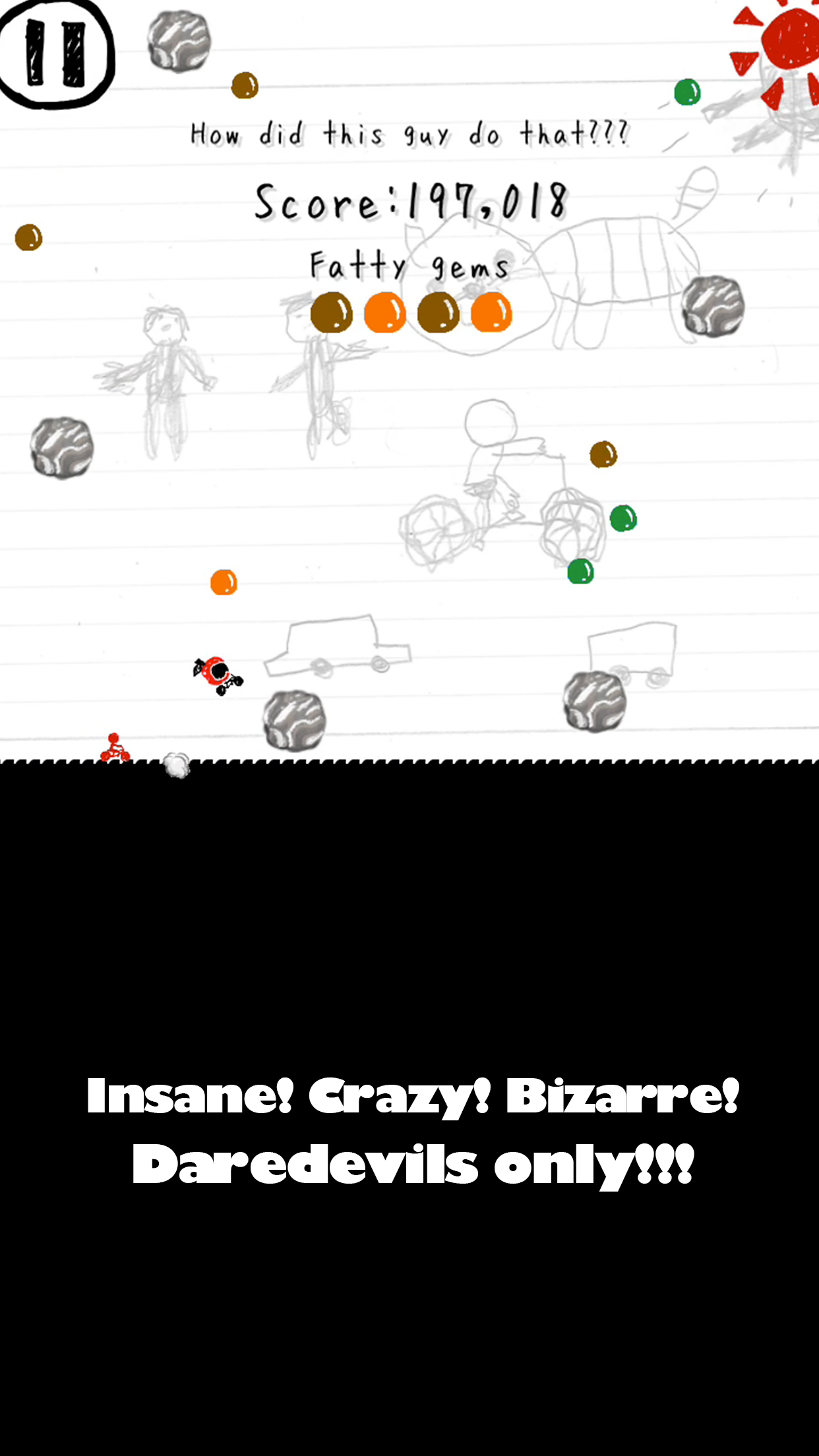 So potential rider, here is a short crash course about Bike Rider. First off, we're not riding on your typical offroad terrain with mounds of dirt. That's lame. No, instead riders are cycling through a crazy black-and-white style sketchbook filled with doodles. Riders also get to jam out to a beatbox of HIKAKIN, the heartthrob beatboxer from Japan. How cool! As for the goal? Riders must snag as many fatty gems as possible as they fly, jump, and do insane summersaults. Also did I mention, as you're riding you also have to dodge the red daggers, weave through boulders, and escape from the red guy? It's insane. It's extreme. But it's worth it. This game has some extreme rewards.