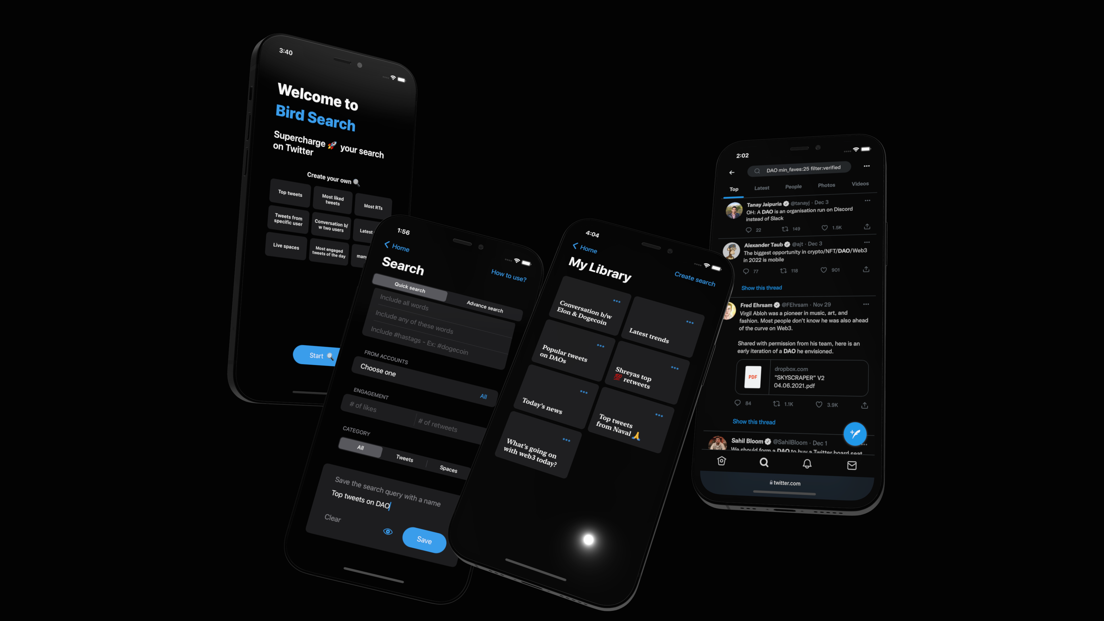 Search tool on twitter is a gold mine for surfacing the most valuable tweets, whether it's the top tweets, most engaged tweets, viral tweets, tweets from specific users, media, news etc, it makes it easier to separate the signal substance from the noise. However, Twitter search has been stagnant for many years in terms of refining the search, and UX on website and one cannot construct their own advanced search queries on mobile, which is where Bird search comes in.