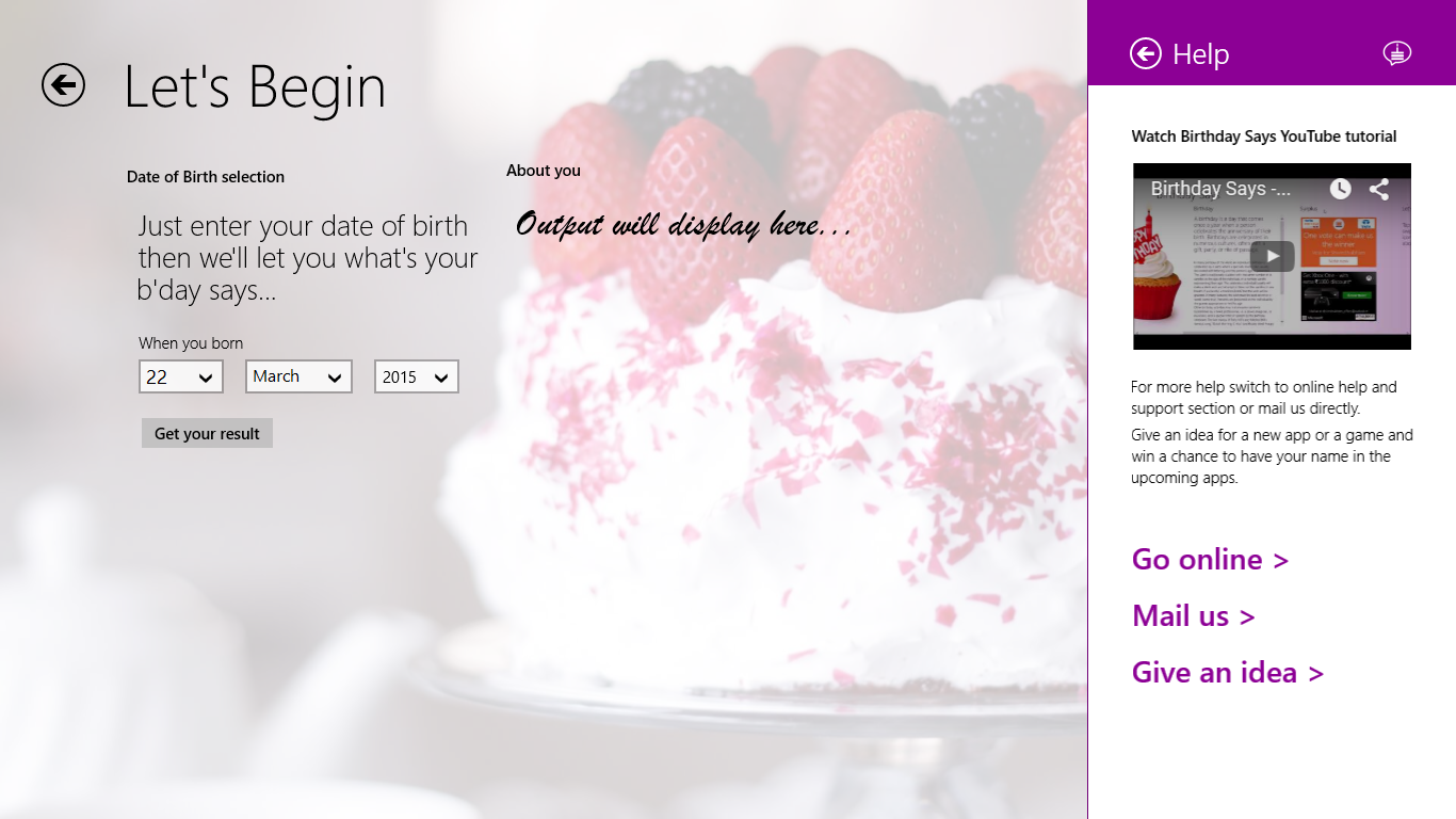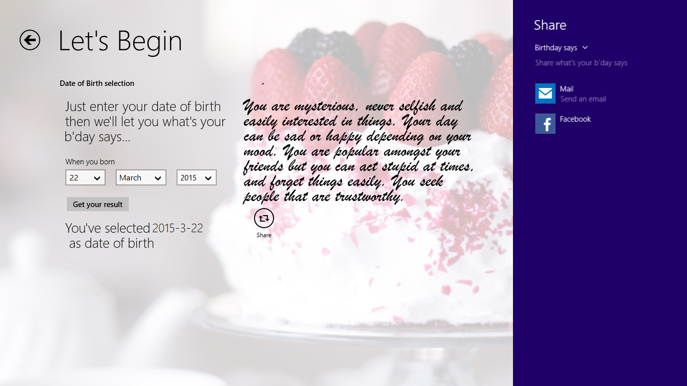 The beautiful and sleek designed Birthday Says elaborates the rich features about your birthday with new mouth-watering cakes photographs every week. Just with little taps you'll get to know what's your birthday actually says about you. So, enjoy with your family and friends. Designed for Windows Phone and Windows Store .