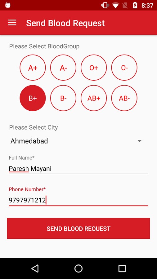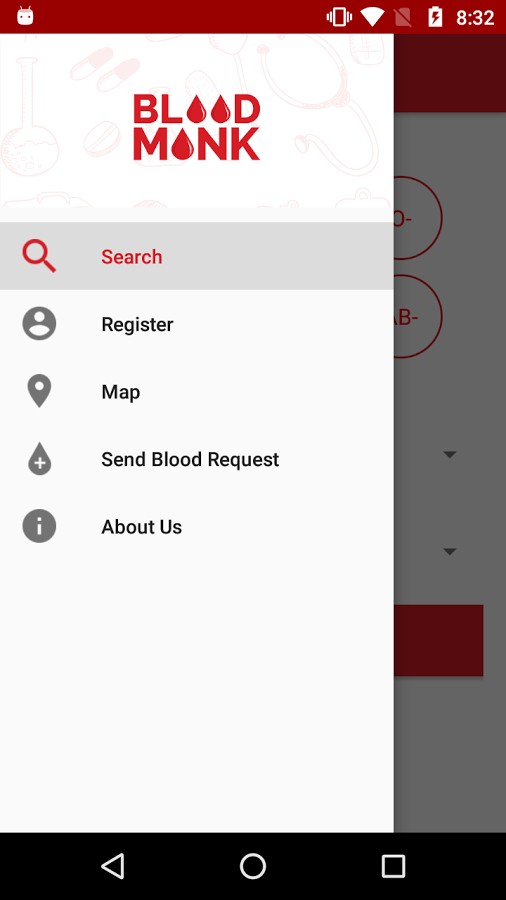 - The second tab named as “Search Blood Monk” focuses on helping users select their blood group and their home area. Users can search the related blood group users in their area after clicking on the search button. Whats more, users or their relatives can also call, message and mail to any particular blood donor. The users will have all the contact details for a particular blood donor, that they have selected from the donor’s list.