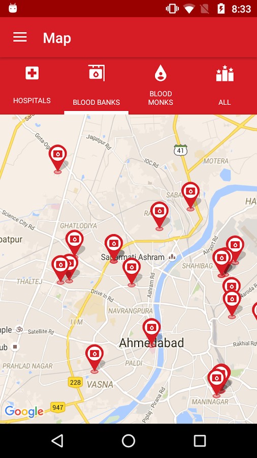 - The third effective tab is the “Monks on Map” contains information on all the registered blood donors, all major hospitals and the related or associated blood banks, which will be displayed on the Google Map. A filtering facility is also available for the users, so that they can choose any of the categories and have their desired results on the Google Map with root.