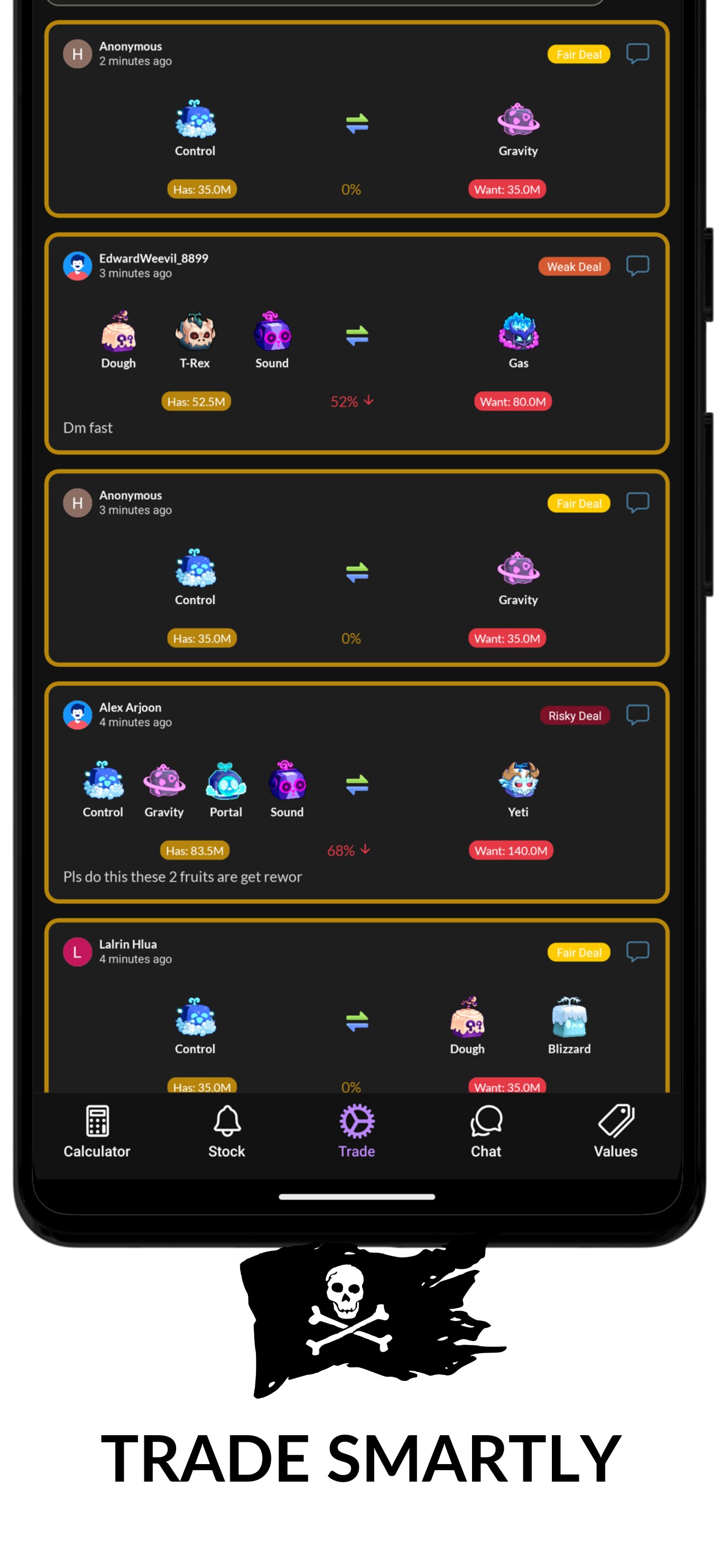 Value Calculator: Easily calculate and compare trade values to ensure you’re getting the best deals. Input items and instantly see if a trade is fair or needs adjustment.