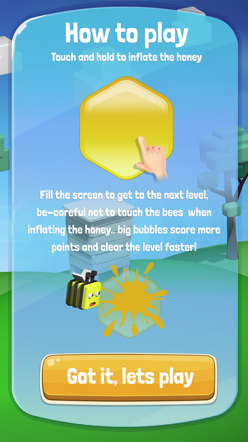The game is simple you fill the screen up with honey bubbles and trap the bees, but don’t let the bees touch the bubble as you blowing it up as it will pop and after so many tries its game over!