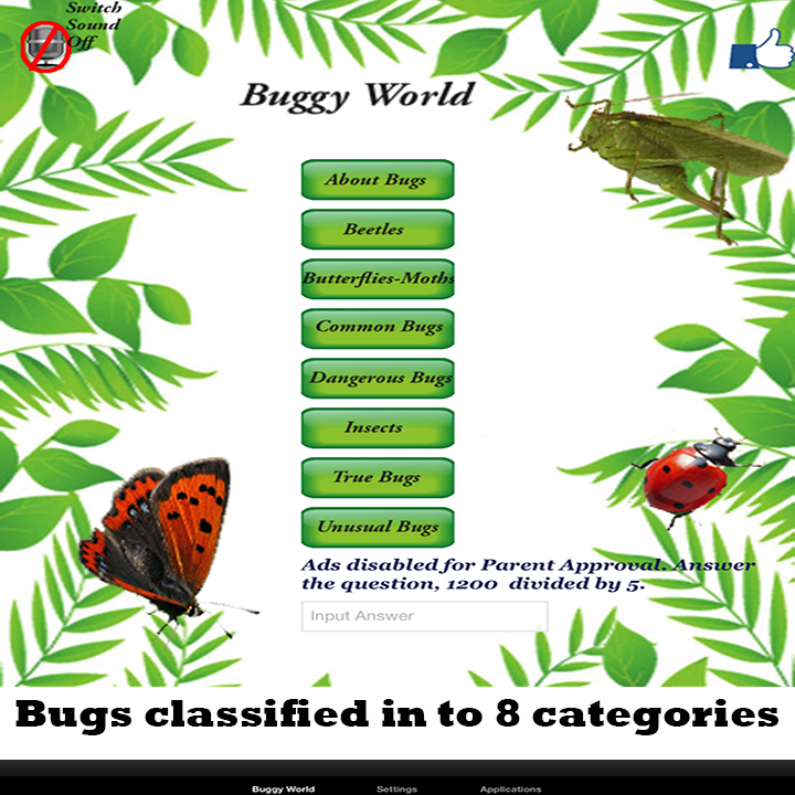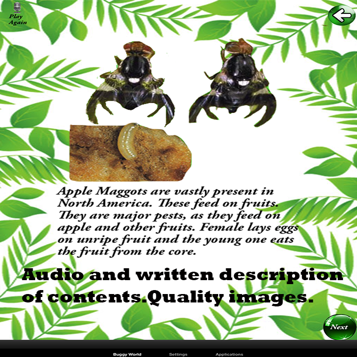 Buggy World uses simple language. Audio in this application help aid who are physically impaired to hear things. There is also an option to mute the audio if required. This application describes the effect, causes and also importance of bugs in Nature. The application uses simple English for kids to understand better.