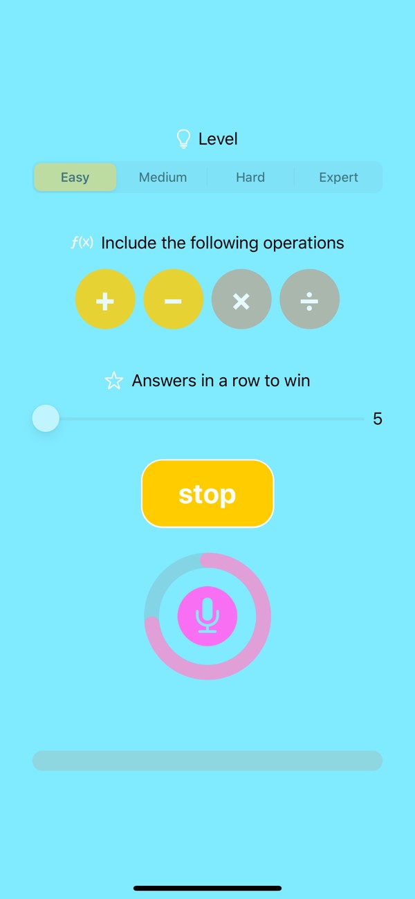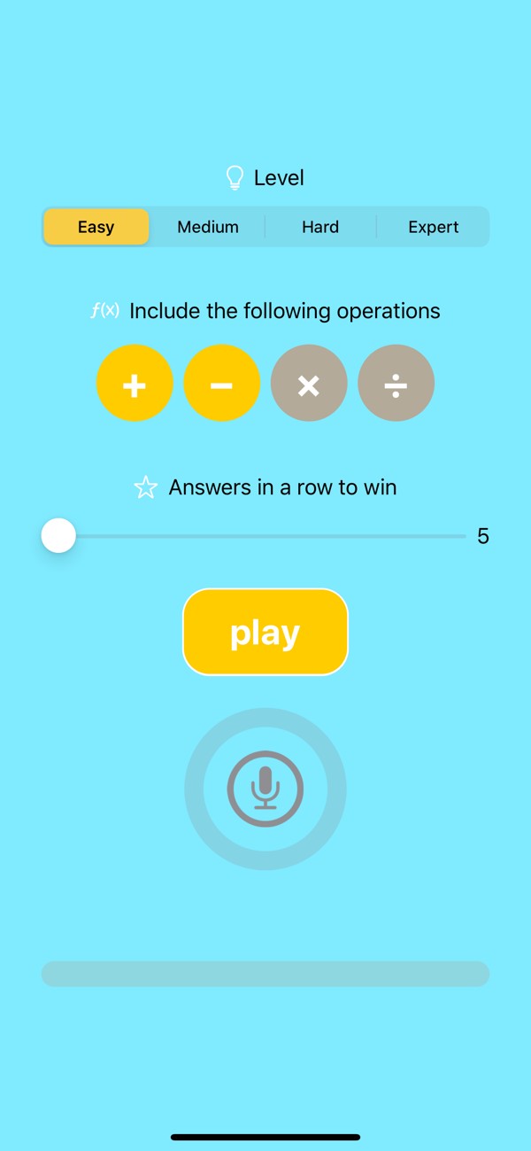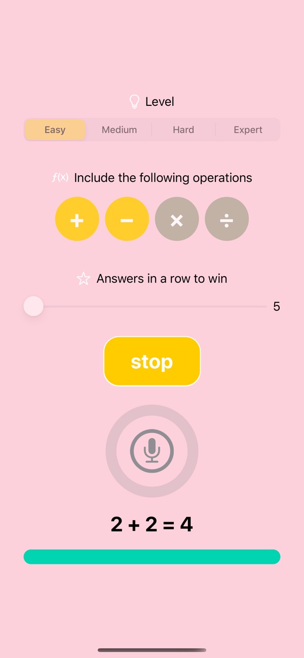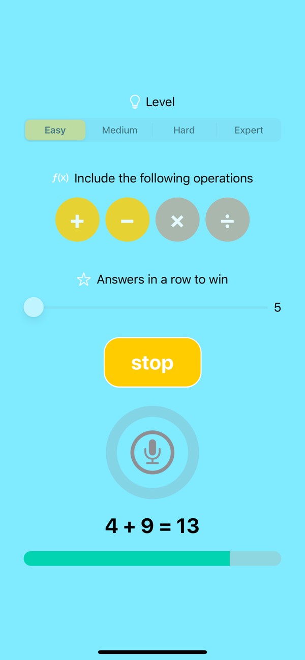 The app tells you calculations aloud, and you have to respond out loud within the time limit. The app automatically recognizes your voice, and provides you with the correct answer when needed. Give the right answers in a row to win!