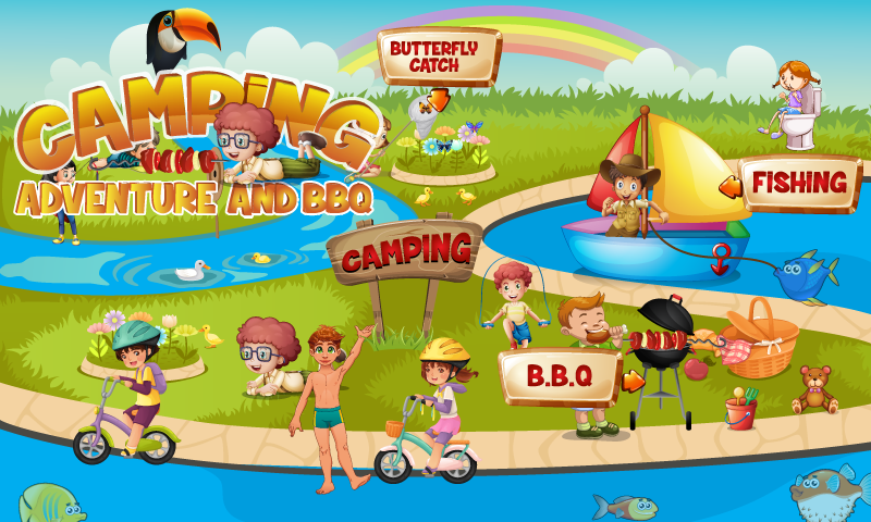 There are a number of activities lined up for you. Whoever finishes all the activities at the first place can enjoy the bbq food as well on top priority :) Catch the Butter Flies to complete the first level of this crazy camping adventure and bbq cooking game. Then comes up the next level in which you have to pick up the fishes from the pond type pool to complete this mission. Whoever will complete those two activities at the first place can proceed to the chef cooking and kitchen adventure level. Enjoy the tasty bites and delicious bbq cooked food with famous and crazy chefs. You can learn exciting and delicious bbq recipes and you can become an expert chef yourself as well.