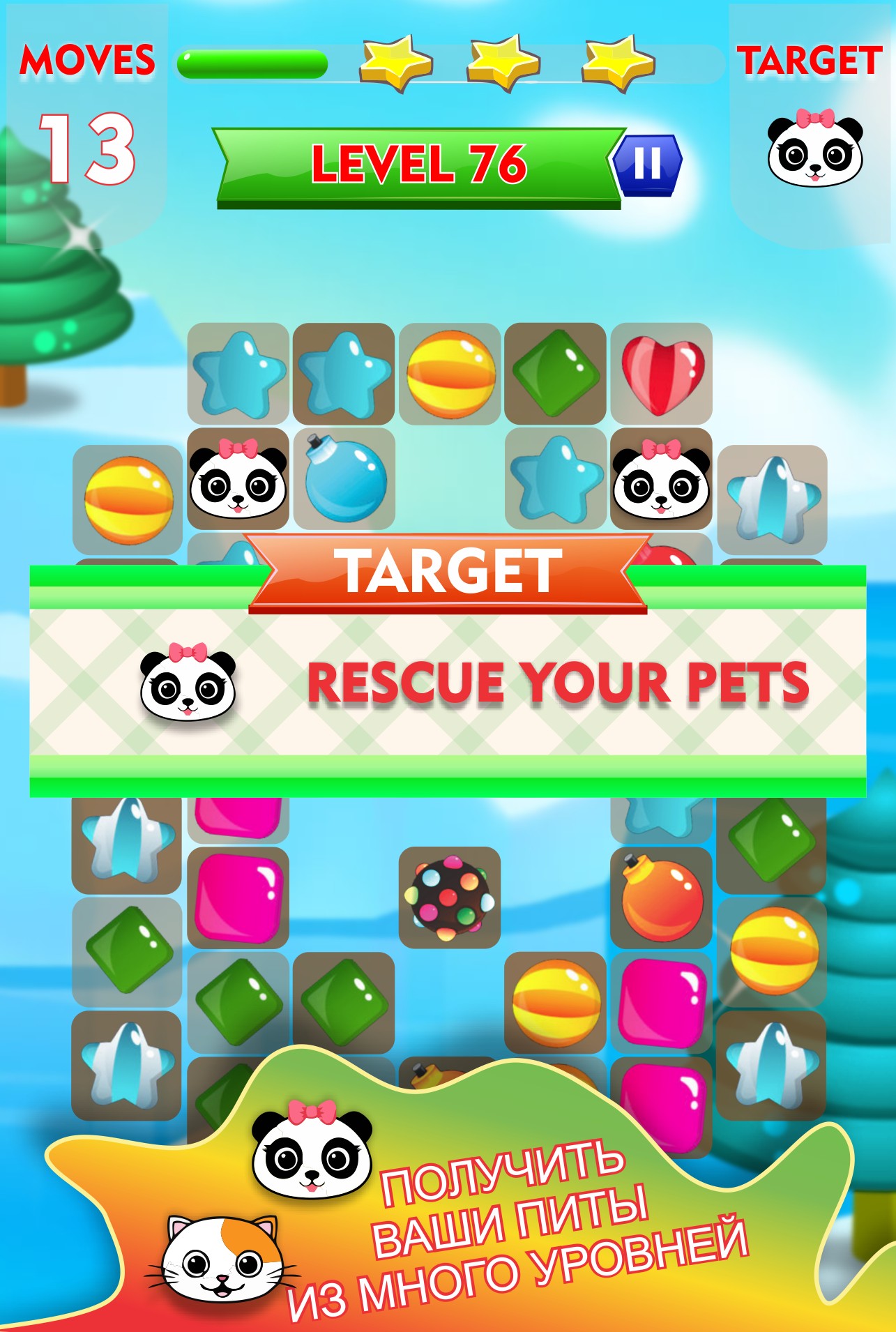 Explore a sweet world of delicious candies and rescue your pet animals and make fun of match-3 puzzle game.