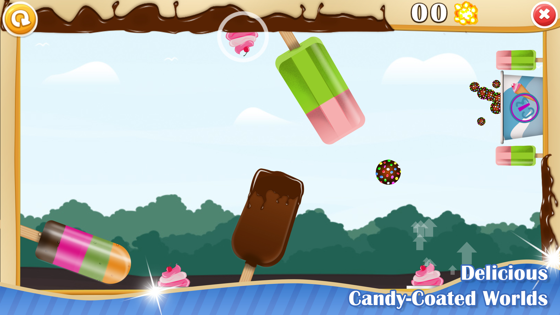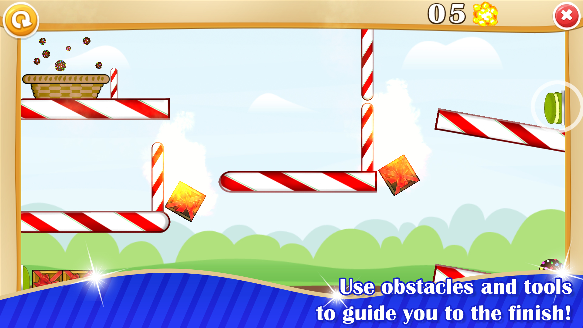 Try to guide your candy through many beautiful candy-coated worlds full with dangerous "or helpful" obstacles. Every world comes with different kind of challenges and elements, making it harder and harder to guide your candy on a safe path.
