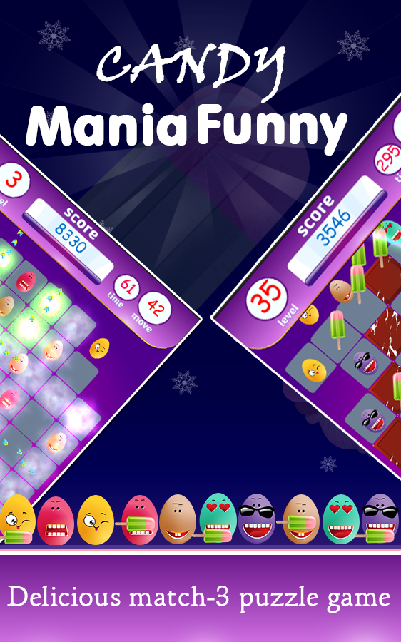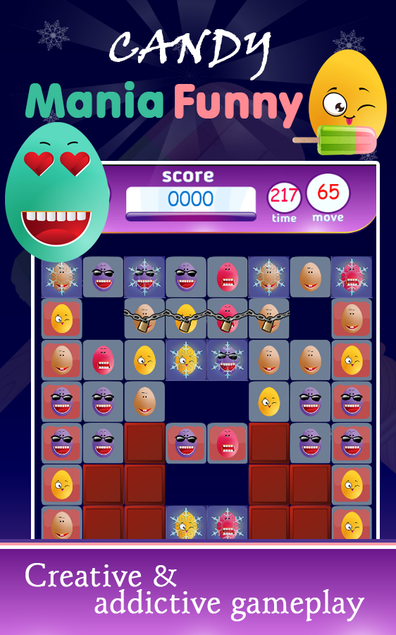 Candy Mania Funny - A fun FREE game, it is a very cool and exciting match-3 puzzle game on Android Market. This fun game is a new puzzle game, and it is very different from egg rescue. We joined in the game Many cool flashy animations, I believe this egg game will bring you the candy amazing journey shocking experience, and the whole game Ball scoreboard.