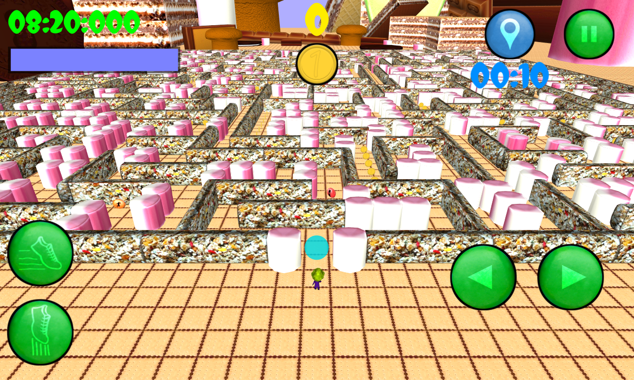 The player has 6 labyrinths composed of different kinds of candy. To unlock the mazes you must get the right amount of coins. In 3D Maze There is also a lot of upgrades to improve the gameplay and to help you pass the maze in less time.
