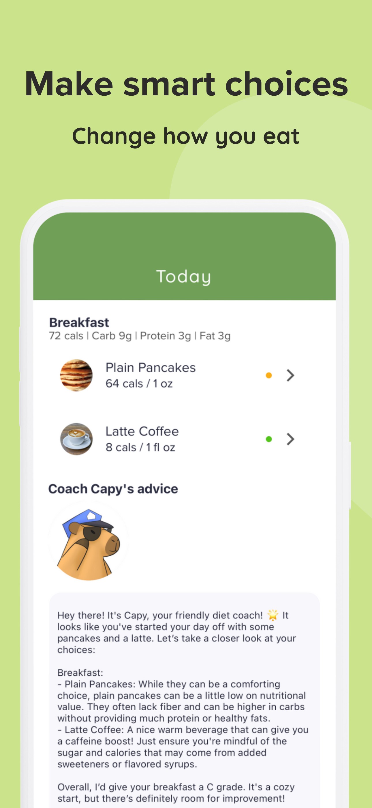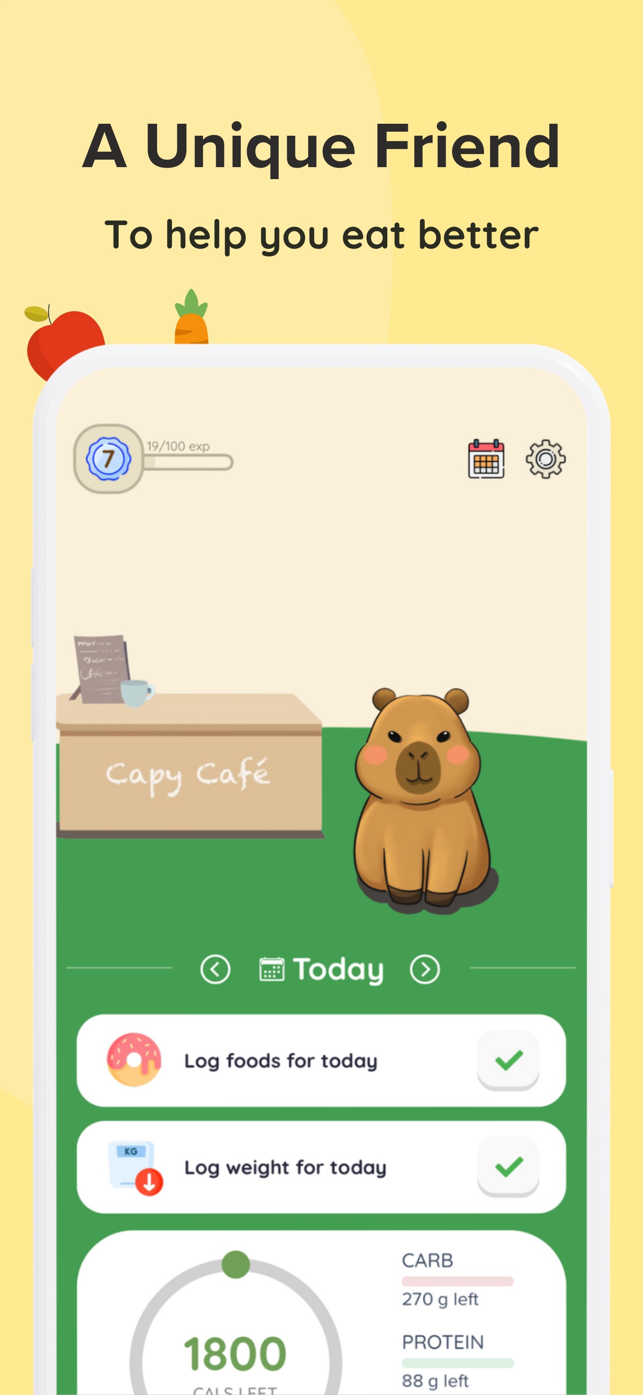Meet Capy, Your diet best friend! Capy Diet is a calorie counter pet that helps you build a better relationship with food, one meal at a time. Simply log your meals, and coach Capy will give you healthy and personalized food suggestions.