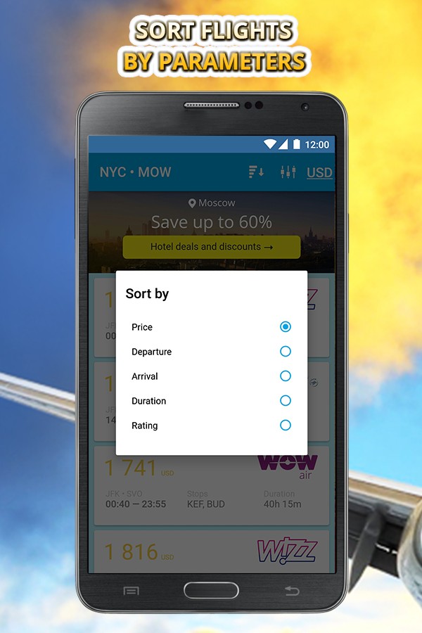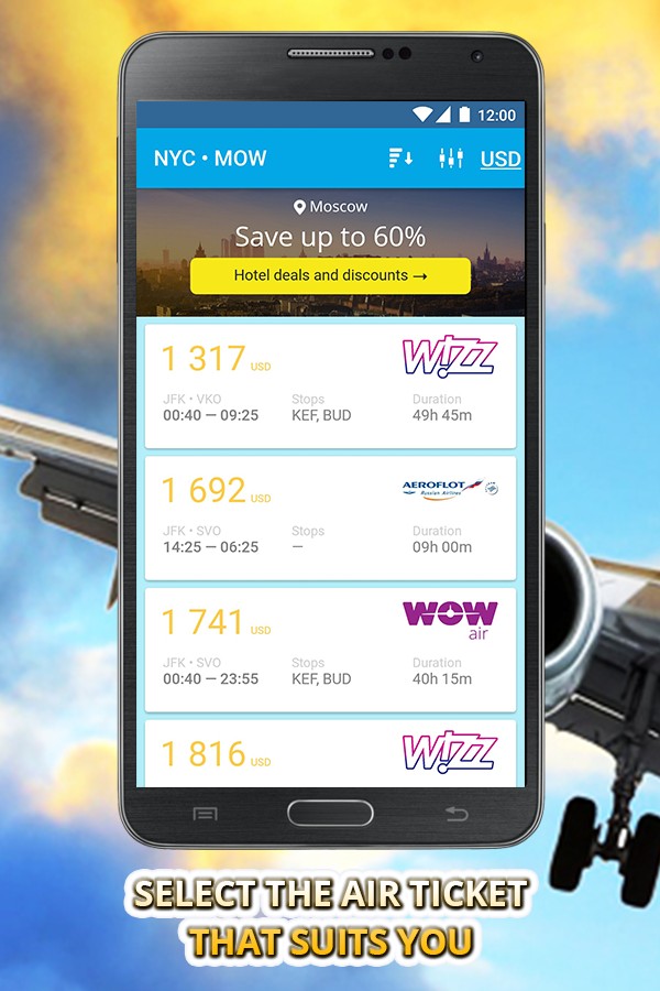 Using the app you will be able to buy cheap tickets online from more than 30 carriers. Here in one place offers from such eminent companies as Emirates, Singapore Airlines, all Nippon, Turkish, Qantas, Garuda Indonesia, Thai Airways, Swiss International, Air New Zealand, Austrian Airlines, Southwest, and also from very budget carriers Norwegian, EasyJet, Asul, Cebu Pacific are collected. If desired, you can sort the search results by airline or Agency that sells tickets.