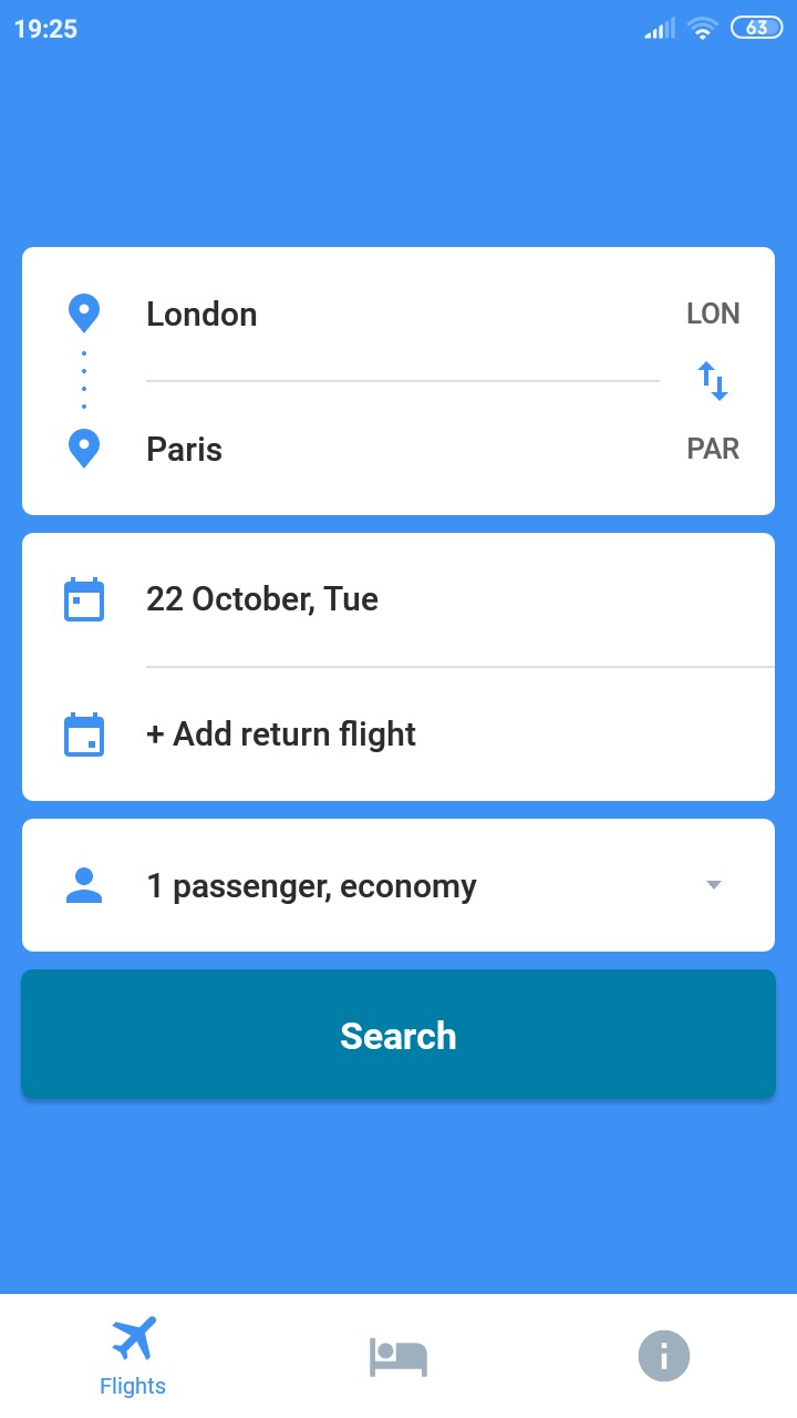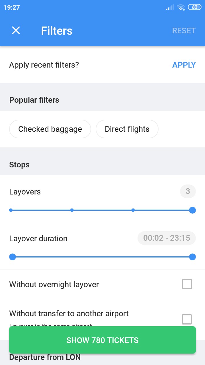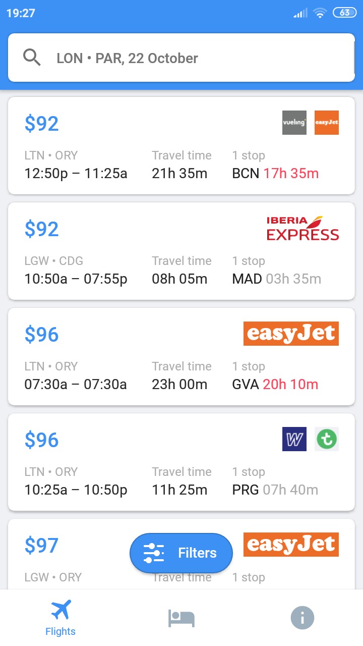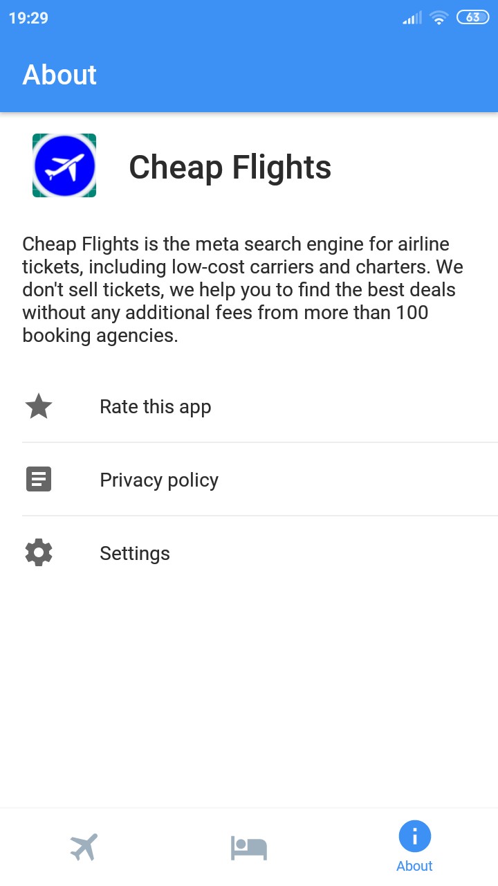 This cheap flights booking app have two search systems: simple and complex (multy sity search), in economy or Business class, you can sort by price, departure, arrival, duration, rating, you can find airfares on outbound take-off time, user can take Journey time, layovers, stopover duration, set possible night stopover, you can set max price for flights, see Airports ratings and choose it yourself, it is possible to see airlines ratings and select yours, it is possibility select alliances: All airlines, airlines that are not part of any alliance, OneWorld, star alliance, all international and domestic agencies, you can mark payment options.
