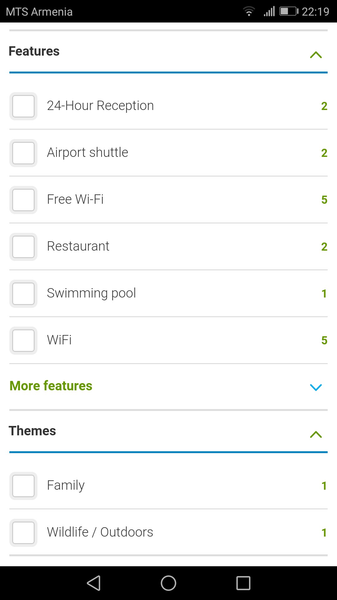 • Search cheapest hotels with main features’: 24 — hour reception, airport shuttle, fitness room, parking, free Wi-Fi, kitchen, kitchenette, sort your search based on location, price, etc.,