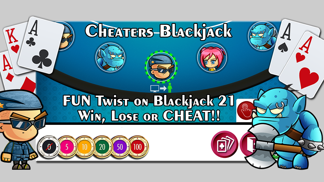 Casino Blackjack 21 with a TWIST!! Cheat and Play against Cheaters to Win Cash. Cheaters Blackjack updates the Classic Casino Gambling Game with Cheating, Wild West Type Showdowns, 6 Game Modes and Worldwide Hi-Score Leaderboards.